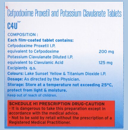 In Treatment of Respiratory tract infection Respiratory tract infections are those infections that can affect the sinuses, throat, airways or lungs. C4U Tablet contains two different medicines, Cefpodoxime Proxetil and Clavulanic Acid, that work together to kill the bacteria that cause respiratory tract infections. Cefpodoxime Proxetil works by stopping the growth of bacteria. Clavulanic Acid reduces resistance and enhances the activity of Cefpodoxime Proxetil against bacteria.u003cbr>u003cbr>It usually makes you feel better within a few days, but you should continue taking it as prescribed even when you feel better to make sure that all bacteria are killed and do not become resistant.
