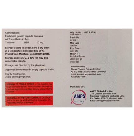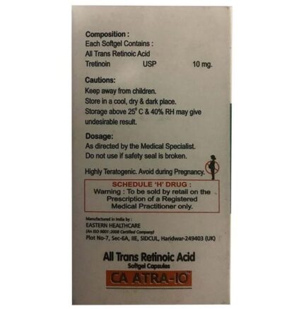 In Treatment of Acne CA Atra 10 Softgel Capsule is a form of vitamin A. It helps treat acne by clearing skin pores and preventing spots or pimples from appearing. It usually takes several weeks to have a noticeable effect so keep using it even if it appears not to be working. Sometimes acne may get worse before it gets better, however, with proper use, your skin will get clearer. The earlier you start using it, the less likely you are to get scars. This medicine will help improve your mood and uplift your confidence as your skin becomes acne-free. It should not be used if you have eczema or sunburned skin.
