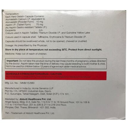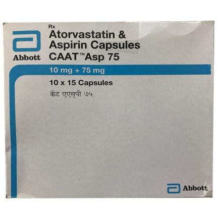 In Treatment of Prevention of heart attack and stroke Caat Asp 75 Capsule is a combination medicine that is used to prevent heart attack. It contains Atorvastatin that works by reducing the amount of “bad” cholesterol (LDL) and raising the amount of “good” cholesterol (HDL) in your blood. High levels of cholesterol can cause your blood vessels to narrow (atherosclerosis). Lowering the amount of cholesterol reduces the chances of heart diseases and stroke and helps you remain healthier for longer. u003cbr>u003cbr>Besides, it also contains a blood thinner, Aspirin, that prevents the formation of blood clots and also prevents the existing ones from growing bigger in size. Take it regularly and make appropriate lifestyle changes (such as eating healthy and staying active) to maximize the effectiveness of this medicine. Keep taking it even if you feel well.