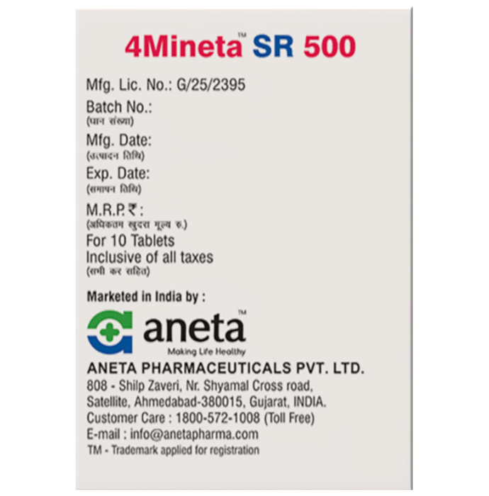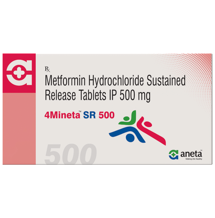 In Treatment of Type 2 diabetes mellitus 4Mineta SR 500 Tablet belongs to a class of medicines called biguanides. It works by lowering glucose production in the liver, delaying the absorption of sugar (glucose) from the intestines, and increasing the body’s sensitivity to insulin. u003cbr>u003cbr>Lowering blood glucose levels is an essential part of managing diabetes. If you can control the level you will reduce the risk of getting any of the serious complications of diabetes such as kidney damage, eye damage, nerve problems, and loss of limbs. Taking this medicine regularly along with proper diet and exercise will help you live a normal, healthy life.