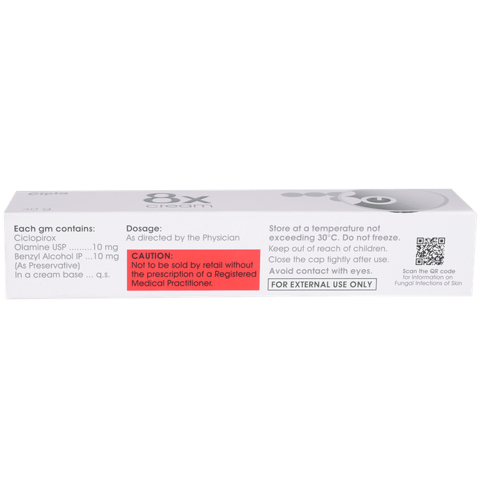 In Fungal skin infections 8X Cream is used to treat skin infections caused by fungi. It works by killing and stopping the growth of fungi. This provides relief from various symptoms, such as pain and itching, caused by the infection and speeds up the healing process. You should keep using it for as long as it is prescribed even if your symptoms have gone. This will prevent the infection from coming back. Using this medicine as prescribed may help you feel more comfortable with your skin.