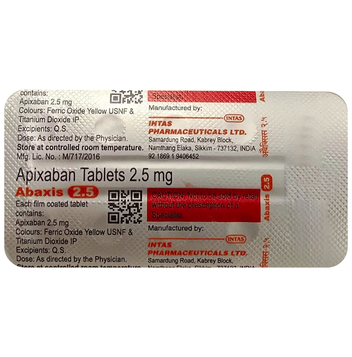 In Treatment and prevention of Blood clots Formation of blood clots blocks one or more veins, usually in your legs. Abaxis 2.5mg Tablet is used to prevent formation of blood clots near the surface of your skin. It dissolves the clots and also relieves pain and inflammation by increasing the blood flow. This improves the overall healing process. Take it as prescribed by the doctor. The condition usually improves on its own in some time. Additionally, the doctor might recommend applying heat to the painful area, elevating the affected leg, using an over-the-counter painkiller and possibly wearing compression stockings.