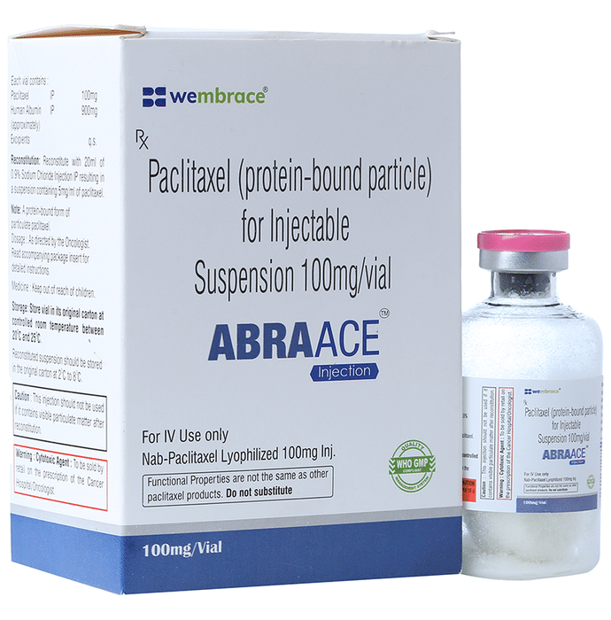 In Treatment of Breast cancer Abraace Injection helps to treat breast cancer and it may be used alone or in combination with other medicines or treatment modalities like chemotherapy. It relieves the symptoms of breast cancer such as breast lumps, bloody discharge from nipples or changes in the shape or texture of the breast. Abraace Injection kills or stops the growth of cancer cells and also prevents the multiplication of cancer cells. Discuss with your doctor if any of the side effects bother you.