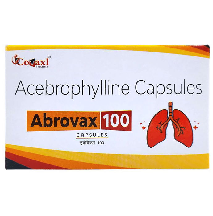 Does birth control pills have any effect on Abrovax 100 Capsule?::: If you are taking birth control pills, dose of Abrovax 100 Capsule need to be reduced as birth control pills may interfere with clearance of Abrovax 100 Capsule, increasing its levels and chances of side effects.| How should Abrovax 100 Capsule be taken?::: Abrovax 100 Capsule should be taken strictly as advised by the doctor. To avoid an upset stomach it should be taken with food. | Is it okay to take furosemide along with Abrovax 100 Capsule?::: One should take proper caution if you are taking furosemide along with Abrovax 100 Capsule. This is because the combined use of these medicines may decrease the levels of potassium. Hence, regular monitoring of potassium levels is required.| When should Abrovax 100 Capsule be avoided?::: Abrovax 100 Capsule should be avoided in patients who are allergic to ambroxol, Abrovax 100 Capsule, or theophylline. Along with that, patients suffering from low blood pressure, irregular heart beats or rhythm or history of heart attack, liver disease or kidney disorder should avoid taking Abrovax 100 Capsule.| Is Abrovax 100 Capsule the same as theophylline?::: Abrovax 100 Capsule comprises of theophylline-7 acetate and ambroxol which makes it effective in making the mucus more fluid and clearing the airways easily, thereby making breathing easier. This effect of Abrovax 100 Capsule works as an added advantage over theophylline. Moreover, it also reduces the need for other medicine used to treat asthma, like salbutamol.: