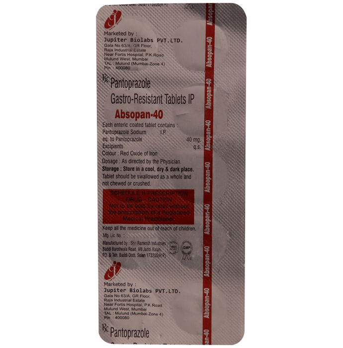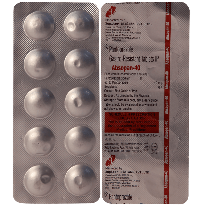 In Treatment of Heartburn Heartburn and acid reflux happens when a muscle above your stomach relaxes too much and allows stomach contents and acid to come back up into your esophagus and mouth. Absopan 40mg Tablet belongs to a group of medicines called proton pump inhibitors. It reduces the amount of acid your stomach makes and relieves the pain associated with heartburn and acid reflux. You can increase the efficiency of the medicine by making certain lifestyle changes. These include avoiding foods that trigger the symptoms, eating smaller more frequent meals, losing weight if you are overweight.