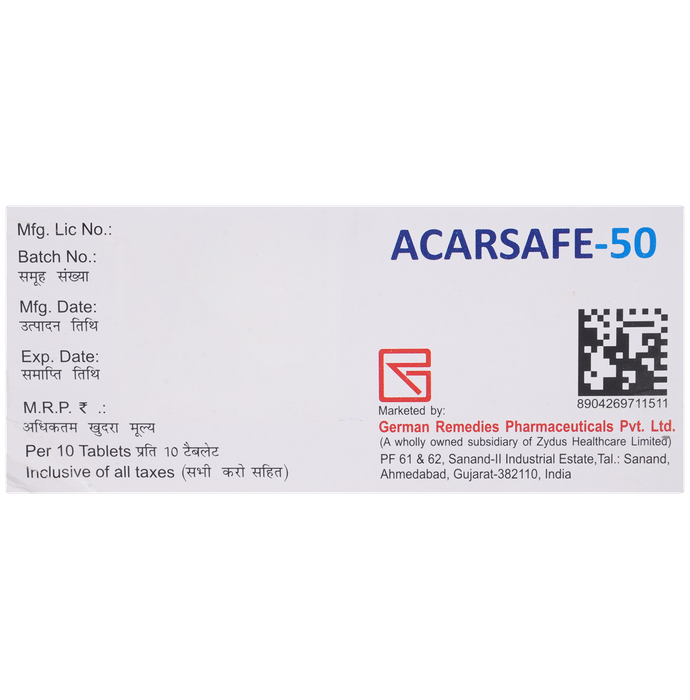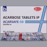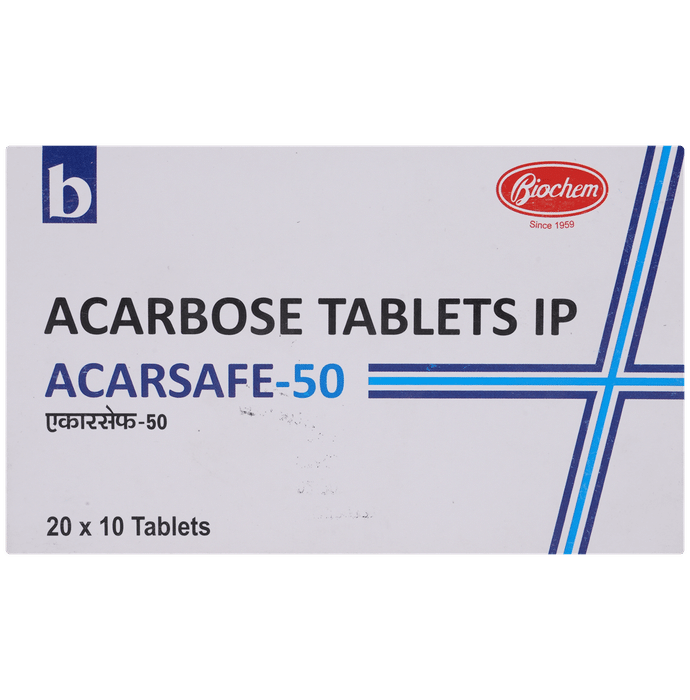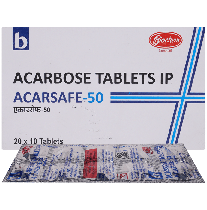 Does Acarsafe 50 Tablet cause hypoglycemia?::: Acarsafe 50 Tablet does not cause hypoglycemia by itself though it has a glucose-lowering effect. However, a fall of blood sugar levels in the hypoglycemic range may occur when given along with other antidiabetic medicines or insulin. If this occurs, consult your doctor who may modify your dose accordingly.| Why does Acarsafe 50 Tablet cause flatulence?::: Acarsafe 50 Tablet blocks the digestion of carbohydrates which causes the accumulation of undigested carbohydrates in the colon. Bacterial fermentation of the accumulated carbohydrates causes intestinal gas, leading to flatulence and abdominal pain.| Can Acarsafe 50 Tablet cause diarrhea?::: Yes, diarrhea is a common side effect of Acarsafe 50 Tablet. However, this does not affect everybody. Any food containing carbohydrates, such as household sugar (cane sugar) can cause diarrhea and severe abdominal pain. If diarrhea persists or becomes severe, then contact your doctor immediately.| When should Acarsafe 50 Tablet be taken?::: Acarsafe 50 Tablet should be taken with your meals and should be swallowed whole with water or chewed with the first mouthful of food. The initial dose of Acarsafe 50 Tablet is generally twice daily. The dose is then gradually increased to thrice daily.| What if I forget to take Acarsafe 50 Tablet?::: If you forget to take a dose of Acarsafe 50 Tablet, do not take the missed dose between meals. Wait for the scheduled dose and meal and continue taking your tablets as prescribed. Do not take the dose twice to make up for your forgotten tablets.| What will happen if more than the recommended dose of Acarsafe 50 Tablet is taken?::: If you take more than the recommended dose of Acarsafe 50 Tablet then it may cause temporary increase in flatulence (accumulation of gas), diarrhea, and abdominal discomfort. It is advised to avoid meals or drinks containing carbohydrates for the next 4-6 hours.| Who should not take Acarsafe 50 Tablet?::: Acarsafe 50 Tablet should be avoided by patients who are allergic to it, have severe liver disease, or have inflammation or ulceration of intestine (eg Crohn’s disease). The use of Acarsafe 50 Tablet should also be restricted in patients who have an intestinal obstruction (cramping pain, vomiting, obstipation, and lack of flatus). In addition, patients who have a large hernia or an intestinal disease where food is not digested or absorbed properly should avoid Acarsafe 50 Tablet. Along with that, Acarsafe 50 Tablet should not be used by women who are pregnant or breastfeeding.| What will happen if more than the recommended dose of Acarsafe 50 Tablet is taken?::: If you take more than the recommended dose of Acarsafe 50 Tablet then it may cause temporary increase in flatulence (accumulation of gas), diarrhea, and abdominal discomfort. It is advised to avoid meals or drinks containing carbohydrates for the next 4-6 hours.: