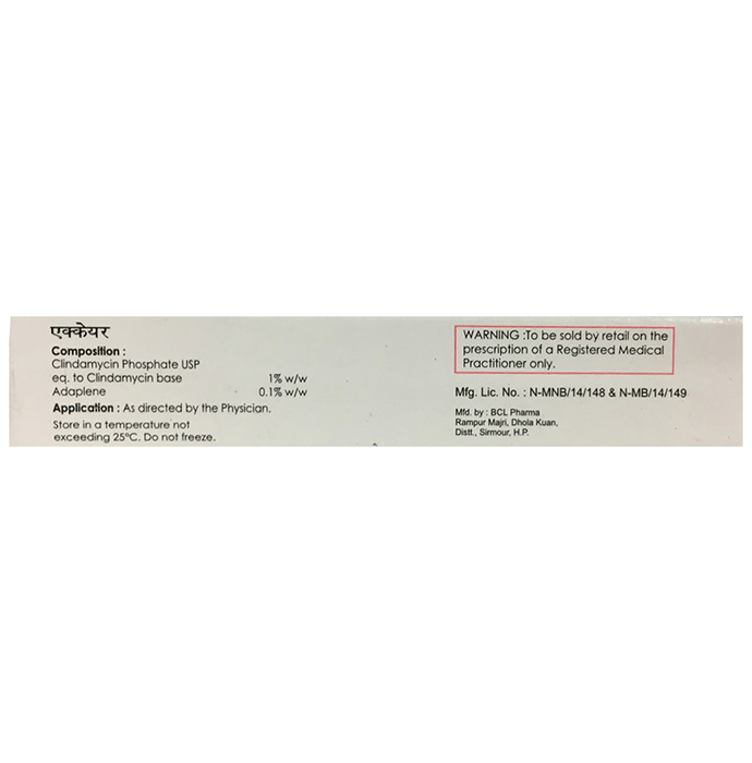 In Treatment of Acne Accare Gel is a combination medicine that helps treat acne (commonly called pimples) by reducing the production of sebum (a natural substance) that causes acne. This kills acne-causing bacteria and prevents spots or pimples from appearing. It usually takes a few weeks to have a noticeable effect so keep using it even if it appears not to be working. Sometimes acne may get worse before it gets better, however, with proper use, your skin will get clearer. The earlier you start using it, the less likely you are to get scars. This medicine will help improve your mood and uplift your confidence as your skin becomes acne-free. It should not be used if you have eczema or sunburned skin.
