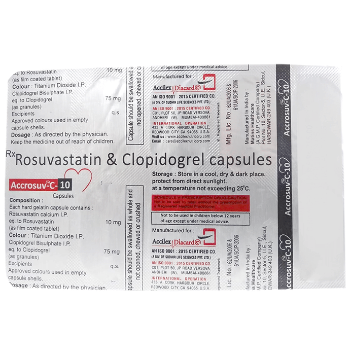 In Prevention of Heart attack If your blood pressure is controlled you are less at risk of having a heart attack or stroke. Accrosuv-C 10 Capsule reduces the chances of heart diseases and helps you remain healthier for longer. Along with taking Accrosuv-C 10 Capsule, make appropriate lifestyle changes, such as eating healthy and staying active, to maintain your blood pressure in the normal range.