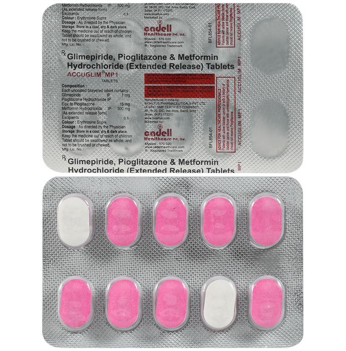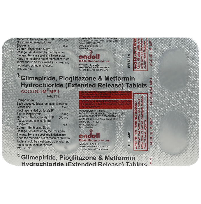 In Treatment of Type 2 diabetes mellitus Accuglim MP 1mg/500mg/15mg Tablet is a medicine that helps to control high blood glucose (sugar) levels. It helps get rid of extra glucose from your body through urine. It also improves the body’s response to the hormone insulin, which is responsible for regulating blood glucose (sugar) levels in our body. The insulin helps to lower your blood glucose levels and prevents them from rising after taking meals. You should keep taking it for as long as it is prescribed.u003cbr>Lowering blood glucose levels is an essential part of managing diabetes. If you can control the level you will reduce the risk of getting any of the serious complications of diabetes such as kidney damage, eye damage, nerve problems, and loss of limbs. Taking this medicine regularly along with proper diet and exercise will help you live a normal, healthy life.