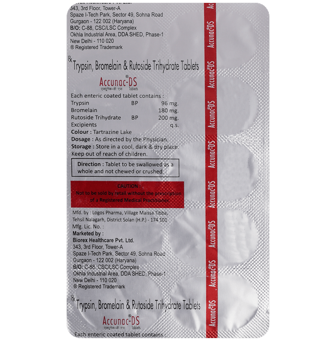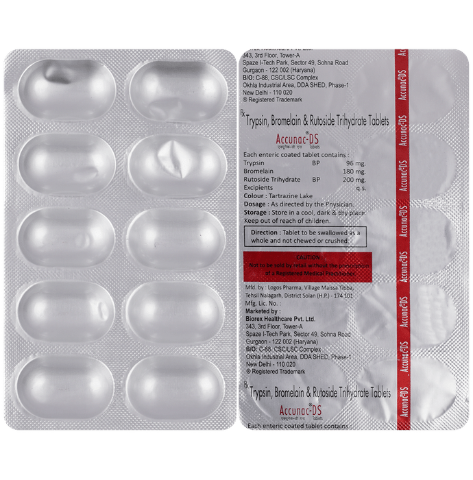 In Pain relief Accunac DS 180mg/96mg/200mg Tablet is a combination of medicines used for relief of pain, inflammation, and swelling in conditions that may occur due to trauma, surgery or everyday life. It may also be used to provide relief in degenerative and inflammatory conditions that affect muscles and joints such as rheumatoid arthritis and osteoarthritis. It promotes speedy recovery due to its anti-inflammatory and antioxidant properties. Take it as it is prescribed to get the most benefit. This will help you to go about your daily activities more easily and have a better, more active, quality of life.