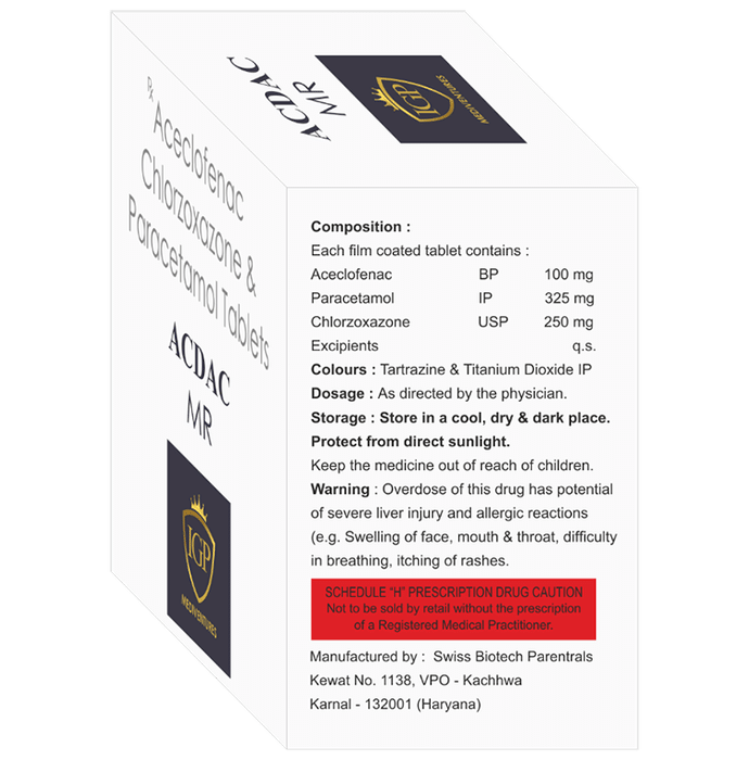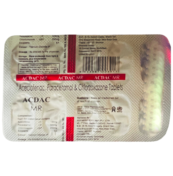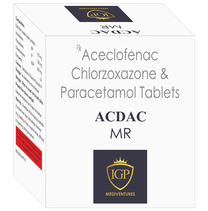 In Treatment of Muscular pain Acdac MR 100mg/325mg/250mg Tablet is a combination medicine that is used to relieve pain, inflammation, and swelling in conditions that affect muscles. Also, it effectively relieves muscle stiffness or spasm, thereby improving muscle movement. It works by blocking chemical messengers in the brain that tell us we have pain.u003cbr>u003cbr>Take it as it is prescribed to get the most benefit. Do not take more or longer than needed as that can be dangerous. In general, you should take the lowest dose that works, for the shortest possible time. This will help you to go about your daily activities more easily and have a better, more active, quality of life.