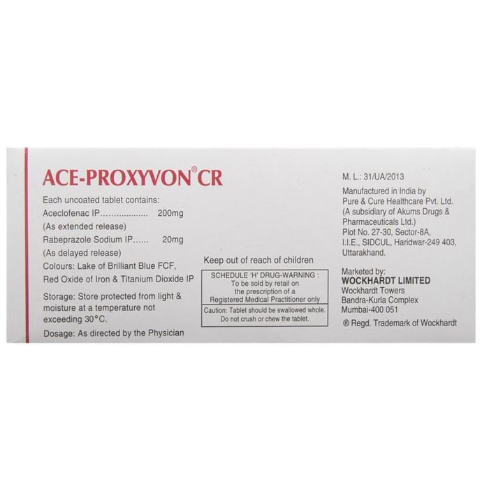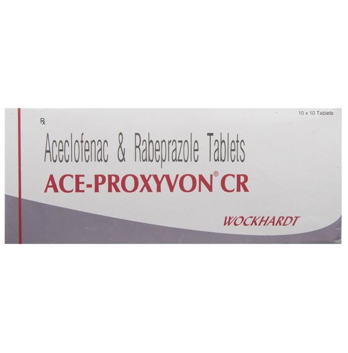 In Pain relief Ace-Proxyvon CR Tablet is a combination medicine used for short-term relief of pain, inflammation, and swelling in conditions that affect joints and muscles. It can help relieve pain in conditions like rheumatoid arthritis and osteoarthritis. But, this pain-relieving action may damage the inner lining of the stomach. Therefore, this medicine also has an active ingredient called Rabeprazole, which reduces the acid secretion in our stomach, thereby reducing the damage caused by the painkillers.u003cbr>u003cbr>Take it as it is prescribed to get the most benefit. Do not take more or for a longer duration than needed as that can be dangerous. In general, you should take the lowest dose that works, for the shortest possible time. This will help you to go about your daily activities more easily and have a better, more active, quality of life.