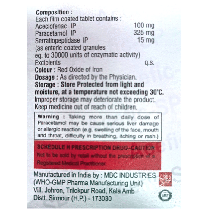 Aceclofenac (100mg) + Paracetamol (325mg) + Serratiopeptidase (15mg):<packagingdetail>:Strip: