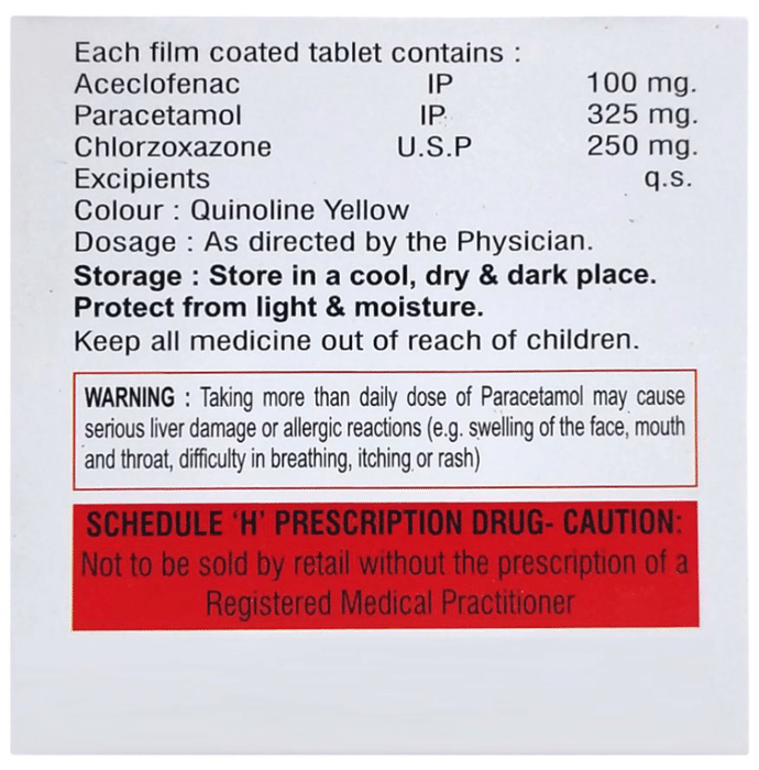 Aceclofenac (100mg) + Paracetamol (325mg) + Chlorzoxazone (250mg):<packagingdetail>:Strip: