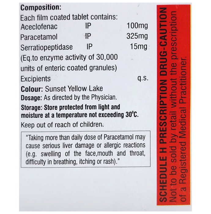 Aceclofenac (100mg) + Paracetamol (325mg) + Serratiopeptidase (15mg):<packagingdetail>:Strip: