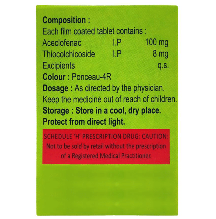 What is Aceflip TH 100mg/8mg Tablet?::: Aceflip TH 100mg/8mg Tablet is a combination of two medicines: Aceclofenac and Thiocolchicoside. This medication helps in relieving muscle pain. It relaxes the muscles by acting on the central nervous system and lowering chemical substance in the body that cause pain and inflammation.| Is it safe to use Aceflip TH 100mg/8mg Tablet?::: Yes, Aceflip TH 100mg/8mg Tablet is safe for most of the patients. However, in some patients it may cause some common unwanted side effects like nausea, vomiting, stomach pain, heartburn, diarrhoea and other uncommon and rare side effects. Inform your doctor if you experience any persistent problem due to the medication.| Can the Aceflip TH 100mg/8mg Tablet be stopped when my pain is relieved?::: Aceflip TH 100mg/8mg Tablet is usually used for short term and can be discontinued when the pain is relieved. However, Aceflip TH 100mg/8mg Tablet should be continued if your doctor has advised you to do so.| Can the use of Aceflip TH 100mg/8mg Tablet cause dizziness?::: Yes, the use of Aceflip TH 100mg/8mg Tablet can cause dizziness (feeling faint, weak, unsteady or lightheaded) in some patients. If you feel dizzy or lightheaded, it is better to rest for some time and resume once you feel better.| Are there any specific contraindications associated with the use of Aceflip TH 100mg/8mg Tablet?::: The use of Aceflip TH 100mg/8mg Tablet is considered to be harmful for patients with known allergy to painkillers or any of the components or excipients of this medicine. The use of this medicine should preferably be avoided in patients with a history of stomach ulcer or in patients with active, recurrent stomach ulcer/bleeding. It should also be avoided in patients with history of heart failure, high blood pressure, and liver or kidney disease.| Can Aceflip TH 100mg/8mg Tablet be taken with Vitamin B-complex?::: Yes, Aceflip TH 100mg/8mg Tablet can be taken with Vitamin B-complex preparations. While Aceflip TH 100mg/8mg Tablet helps to relieve pain, Vitamin B-complex can help to correct the vitamin deficiency that might be causing your symptoms.| Can the use of Aceflip TH 100mg/8mg Tablet cause damage to kidneys?::: Yes, the long-term use of Aceflip TH 100mg/8mg Tablet can cause damage to the kidneys. Normal kidneys produce a chemical called prostaglandins that protects them from damage. Use of painkillers lower the levels of prostaglandins in the body which leads to kidney damage on long-term use. Use of painkillers is not recommended in patients with underlying kidney disease.| Will Aceflip TH 100mg/8mg Tablet be more effective if taken in higher doses?::: No, taking more of this medicine will not make it more effective, rather it can lead to increased side effects. If the symptoms are getting severe, please consult the doctor for re-evaluation.:
