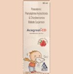 What is Acegreat-CD Oral Suspension Raspberry?::: Acegreat-CD Oral Suspension Raspberry is a combination of three medicines: Chlorpheniramine, Paracetamol / Acetaminophen and Phenylephrine. This combination helps to relieve symptoms of cold like runny nose, watery eyes, fever and headache. Chlorpheniramine is an antiallergic. It relieves allergy symptoms like runny nose, watery eyes and sneezing. Paracetamol blocks the release of certain chemical messengers in the brain that are responsible for pain and fever. Phenylephrine is a decongestant which narrows the small blood vessels and provides relief from congestion or stuffiness in the nose.| Is it safe to use Acegreat-CD Oral Suspension Raspberry?::: Yes, Acegreat-CD Oral Suspension Raspberry is safe in most patients. However, in some patients it may cause common side effects like nausea, vomiting, allergic reaction, sleepiness, headache and other uncommon or rare side effects. Inform the doctor if you experience any persistent problem while taking this medicine.| Can I stop taking Acegreat-CD Oral Suspension Raspberry when I am relieved of my symptoms?::: Acegreat-CD Oral Suspension Raspberry is usually used for short term and can be discontinued when your symptoms are relieved. However, continue taking this medicine if your doctor has advised you to do so.| Can the use of Acegreat-CD Oral Suspension Raspberry cause dizziness?::: Yes, the use of Acegreat-CD Oral Suspension Raspberry can cause dizziness (feeling faint, weak, unsteady or lightheaded) in some patients. If you feel dizzy or lightheaded, it is better to rest for some time and resume once you feel better.| Can the use of Acegreat-CD Oral Suspension Raspberry cause damage to liver?::: Acegreat-CD Oral Suspension Raspberry is usually safe when taken according to the recommended dose. However, an overdose of Acegreat-CD Oral Suspension Raspberry can damage your liver. Avoid drinking alcohol, while taking this medicine as it may increase your risk of liver damage.| What is the recommended storage condition for the Acegreat-CD Oral Suspension Raspberry?::: Keep this medicine in the container or the pack it came in, tightly closed. Store it according to the instructions mentioned on the pack or label. Dispose of the unused medicine. Make sure it is not consumed by pets, children and other people.: