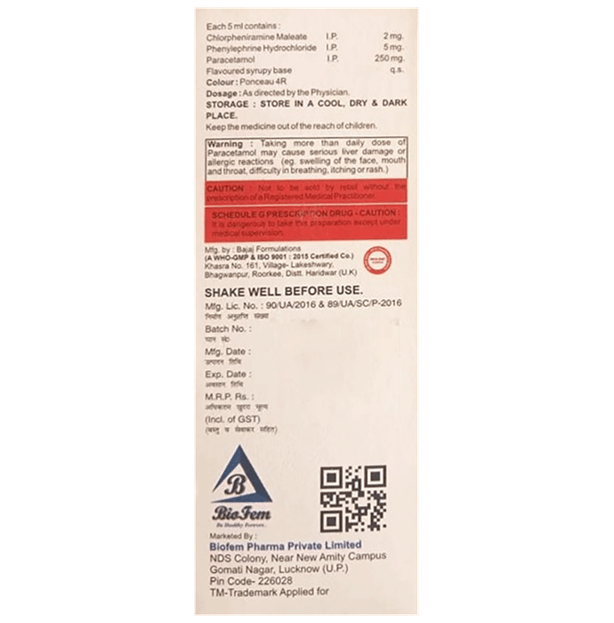 Chlorpheniramine Maleate (2mg/5ml) + Paracetamol (250mg/5ml) + Phenylephrine (5mg/5ml):<packagingdetail>:Bottle: