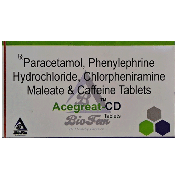 What is Acegreat-CD Tablet?::: Acegreat-CD Tablet is a combination of four medicines: Caffeine, Chlorpheniramine, Paracetamol and Phenylephrine. This combination is helpful in relieving the symptoms of cold. These symptoms may include body ache, headache, fatigue, fever, watery eyes, sneezing, cough, sore throat, and runny and stuffy nose.| Are there any foods which I have to avoid while taking Acegreat-CD Tablet?::: Acegreat-CD Tablet contains caffeine. So, it is preferable to avoid medicines or food that contain caffeine. Foods like coffee, tea, cola drinks and chocolate should be avoided as they may add to your total caffeine intake. Increased caffeine intake can cause difficulty in sleeping, you may experience tremors and/or have chest discomfort. Also, avoid drinking alcohol (beer, wine, etc.) while taking this medicine.| What are the instructions for the storage and disposal of Acegreat-CD Tablet?::: Store your medicines in a cool dry place and keep them in the original pack or container until it is time to take them. Store them out of sight and reach of children. Unused medicines should be disposed of in special ways to ensure that pets, children and other people cannot consume them.| Are there any serious side effects associated with the use of Acegreat-CD Tablet?::: Serious side effects with Acegreat-CD Tablet are uncommon and rare. Tell your doctor as soon as possible if you notice allergic reactions, skin rash or peeling, mouth ulcers, breathing problems, unexplained bleeding, recurrent fevers or infections, vision disturbances, fast or irregular heartbeat.| Will a higher than the recommended dose of Acegreat-CD Tablet be more effective?::: No, taking a higher than the recommended dose may not be more effective, rather it may increase the chances of having serious side effects and toxicity. If the recommended doses do not relieve your symptoms or there is an increased severity of your symptoms, please consult your doctor.| Are there any contraindications associated with the use of Acegreat-CD Tablet?::: It is not recommended to use Acegreat-CD Tablet if you have high blood pressure (hypertension), any underlying serious heart condition or cardiovascular disorder, any history of stomach ulcers or overactive thyroid (hyperthyroidism). However, it can be taken if advised by the doctor. Its use should also be avoided if you are taking antidepressant drugs. These drugs, called monoamine oxidase inhibitors (MAOIs), may include phenelzine and isocarboxazid or tricyclic antidepressants like imipramine and amitriptyline.| Can I breastfeed while taking Acegreat-CD Tablet?::: No, it is not advisable to breastfeed while using Acegreat-CD Tablet. This medicine contains Chlorpheniramine, an antihistamine which can pass into the breast milk and may harm the baby. Inform your doctor that you are breastfeeding if you are advised to take this medicine.| What is Acegreat-CD Tablet?::: Acegreat-CD Tablet is a combination of four medicines: Caffeine, Chlorpheniramine, Paracetamol and Phenylephrine. This combination is helpful in relieving the symptoms of cold. These symptoms may include body ache, headache, fatigue, fever, watery eyes, sneezing, cough, sore throat, and runny and stuffy nose.| Are there any foods which I have to avoid while taking Acegreat-CD Tablet?::: Acegreat-CD Tablet contains caffeine. So, it is preferable to avoid medicines or food that contain caffeine. Foods like coffee, tea, cola drinks and chocolate should be avoided as they may add to your total caffeine intake. Increased caffeine intake can cause difficulty in sleeping, you may experience tremors and/or have chest discomfort. Also, avoid drinking alcohol (beer, wine, etc.) while taking this medicine.| Are there any serious side effects associated with the use of Acegreat-CD Tablet?::: Serious side effects with Acegreat-CD Tablet are uncommon and rare. Tell your doctor as soon as possible if you notice allergic reactions, skin rash or peeling, mouth ulcers, breathing problems, unexplained bleeding, recurrent fevers or infections, vision disturbances, fast or irregular heartbeat.| Will a higher than the recommended dose of Acegreat-CD Tablet be more effective?::: No, taking a higher than the recommended dose may not be more effective, rather it may increase the chances of having serious side effects and toxicity. If the recommended doses do not relieve your symptoms or there is an increased severity of your symptoms, please consult your doctor.| Are there any contraindications associated with the use of Acegreat-CD Tablet?::: It is not recommended to use Acegreat-CD Tablet if you have high blood pressure (hypertension), any underlying serious heart condition or cardiovascular disorder, any history of stomach ulcers or overactive thyroid (hyperthyroidism). However, it can be taken if advised by the doctor. Its use should also be avoided if you are taking antidepressant drugs. These drugs, called monoamine oxidase inhibitors (MAOIs), may include phenelzine and isocarboxazid or tricyclic antidepressants like imipramine and amitriptyline.| Can I breastfeed while taking Acegreat-CD Tablet?::: No, it is not advisable to breastfeed while using Acegreat-CD Tablet. This medicine contains Chlorpheniramine, an antihistamine which can pass into the breast milk and may harm the baby. Inform your doctor that you are breastfeeding if you are advised to take this medicine.| What are the instructions for the storage and disposal of Acegreat-CD Tablet?::: Store your medicines in a cool dry place and keep them in the original pack or container until it is time to take them. Store them out of sight and reach of children. Unused medicines should be disposed of in special ways to ensure that pets, children and other people cannot consume them.| What is Acegreat-CD Tablet?::: Acegreat-CD Tablet is a combination of four medicines: Caffeine, Chlorpheniramine, Paracetamol and Phenylephrine. This combination is helpful in relieving the symptoms of 