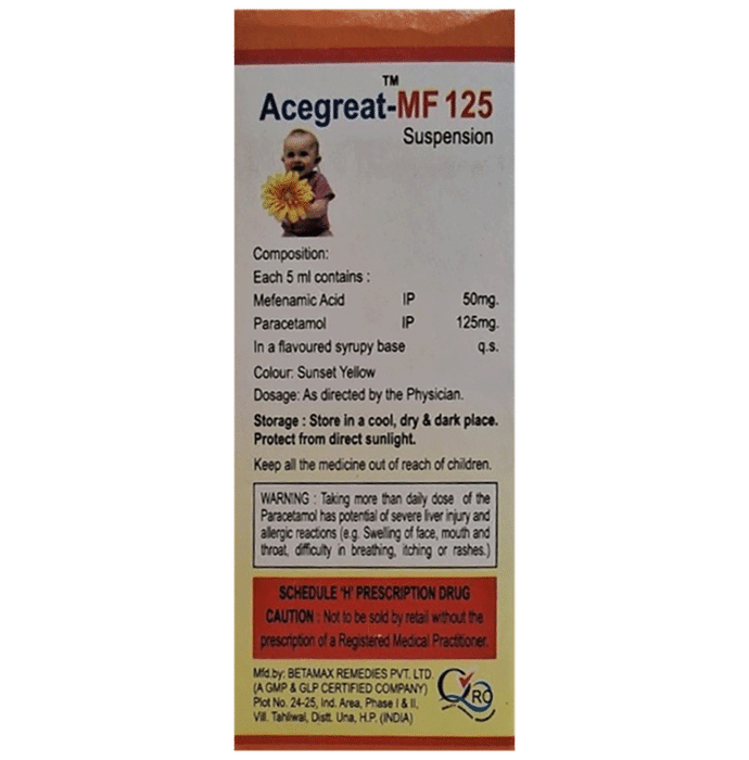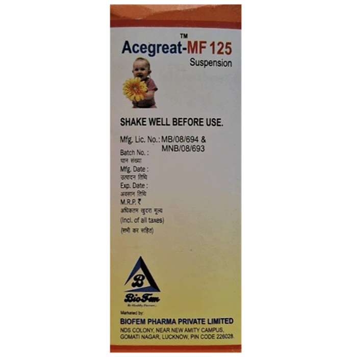 How much Acegreat-MF 125 Oral Suspension should I give to my child?::: Your doctor will prescribe the dose according to your child’s condition and body weight. Stick to the prescribed dosing schedule as that is the best way to ensure safe and complete recovery of your child.| Can I change the dose of Acegreat-MF 125 Oral Suspension for my child by myself according to the severity of illness?::: No, it is not recommended to alter the dose of the medicine without consulting a doctor. While an unnecessary increase in dose may lead to toxicity, a sudden lowering of the dosing may cause recurrence of symptoms. So, for best results, speak to your child’s doctor if you feel a change in dose may be needed.| Can all children be given the same dose of Acegreat-MF 125 Oral Suspension?::: No. Acegreat-MF 125 Oral Suspension cannot be given to everyone in the same dose. The doctor decides the appropriate dose based on the child’s age and body weight. Since the dose changes so unpredictably, you must never give any dose of this medicine to anyone without consulting a doctor. Follow your doctor’s instructions carefully to get the most benefit.| When will my child feel better?::: The doctor may advise you to keep giving Acegreat-MF 125 Oral Suspension to your child for a few days to weeks, depending upon the severity of the illness. You’ll notice that the pain or fever will reduce and your child will start feeling better gradually as the course approaches its end. In case your child continues to feel unwell even after completion of the full prescribed course of the medicine, consult your child’s doctor as soon as possible.| Are there any serious side effects of this medicine for my child?::: Acegreat-MF 125 Oral Suspension is well-tolerated by most children. However, if your child experiences any intolerable episodes like persistent vomiting, body swelling, decreased urine frequency, serious allergic reaction, and severe pain due to gastric ulcers, then rush to your doctor on an immediate basis.| How should I store Acegreat-MF 125 Oral Suspension?::: Store Acegreat-MF 125 Oral Suspension at room temperature, in a dry place, away from direct heat and light. Avoid leaving medicines within the reach and sight of children.| My child is taking Acegreat-MF 125 Oral Suspension for toothache and now has to undergo an extraction procedure. Should I continue giving Acegreat-MF 125 Oral Suspension?::: Withhold Acegreat-MF 125 Oral Suspension from at least 3 to 5 days before a surgical procedure to prevent excessive bleeding. In case of any confusion, it is best to reach out to your child’s doctor.| Can other medicines be given at the same time as Acegreat-MF 125 Oral Suspension?::: Acegreat-MF 125 Oral Suspension can sometimes interact with other medicines or substances. Tell your doctor about any other medicines your child is taking before starting Acegreat-MF 125 Oral Suspension. Also, check with your child’s doctor before giving any medicine to your child.: