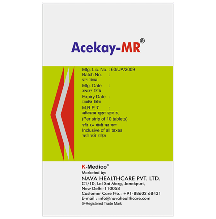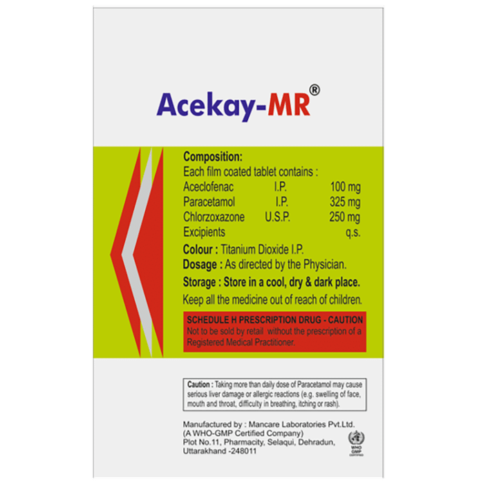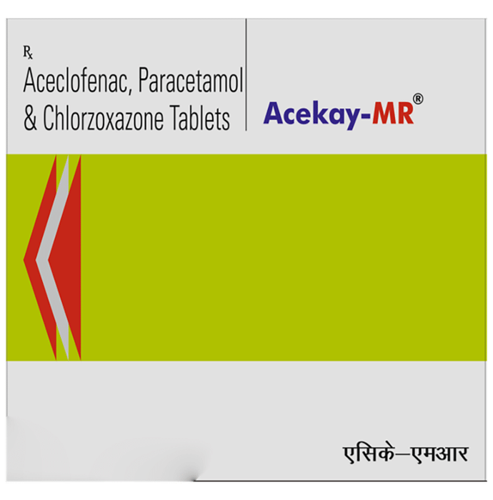 What is Acekay-MR Tablet?::: Acekay-MR Tablet is a combination of three medicines: Aceclofenac, Paracetamol and Chlorzoxazone. This medicine helps in relieving muscle pain by relaxing the affected muscles. It relieves pain caused due to muscle spasm, cramp or injury. It also lowers certain chemical substances in the body that cause pain.| What can I do along with Acekay-MR Tablet to reduce muscle pain?::: If you are suffering from muscle pain due to muscle injury or overuse, you should take rest. Taking rest will help you avoid any further injury and help you recover efficiently. Make sure that you take plenty of sleep and try to reduce stress. Applying ice pack to the affected area may help in relieving pain and inflammation. If your muscle pain is due to some other disease, follow the advice of your doctor.| Can I get addicted to Acekay-MR Tablet?::: No, there are no reports of any patient getting addicted to Acekay-MR Tablet.| Can I stop taking Acekay-MR Tablet when my pain is relieved?::: Acekay-MR Tablet is usually used for short term and can be discontinued when your pain is relieved. However, Acekay-MR Tablet should be continued if you are advised by your doctor to do so.| Can the use of Acekay-MR Tablet cause dizziness?::: Yes, the use of Acekay-MR Tablet can cause dizziness (feeling faint, weak, unsteady or lightheaded) in some patients. If you feel dizzy or lightheaded, it is better to rest for some time and resume once you feel better.| Can the use of Acekay-MR Tablet cause damage to liver?::: Acekay-MR Tablet contains Paracetamol and Chlorzoxazone, both these medicines are known to cause harm to the liver especially when taken in doses above the recommended level. Also, avoid drinking alcohol while taking this medicine, as it may further increase your risk of liver damage. Use of this medicine should preferably be avoided in patients with underlying liver disease. Contact your doctor immediately if you notice any early signs and symptoms of liver damage. These symptoms may include fever, rash, loss of appetite, nausea, vomiting, fatigue, stomach pain, dark urine, yellow skin or eyes and abnormal live enzymes.| How long will Acekay-MR Tablet take to act?::: It may take about an hour to notice the initial benefits of pain relief after taking Acekay-MR Tablet.| What if I forget to take Acekay-MR Tablet?::: If you forget to take the scheduled dose of Acekay-MR Tablet and it is almost time for your next dose, skip the dose you missed and take your next dose at the scheduled time. Otherwise, take it as soon as you remember, and then go back to taking your medicine as you would normally. Do not take a double dose to make up for the dose you missed because this may increase the risk of unwanted side effect due to overdosage. If you are not sure what to do, consult your doctor about how to manage a situation like this.| Will Acekay-MR Tablet be more effective if taken in higher than recommended doses?::: No, taking a higher than the recommended dose may not be more effective, rather it may increase the chances of having some serious side effects and toxicity. If you experience increased severity of your symptoms that are not relieved by the recommended doses, please consult your doctor for re-evaluation.| Are there any specific contraindications associated with the use of Acekay-MR Tablet?::: The use of Acekay-MR Tablet is considered to be harmful in patients with known allergy to any of the components or excipients of this medicine. The use of this medicine should preferably be avoided in patients with a history of stomach ulcers or active, recurrent stomach ulcer / bleeding. It should also be avoided in patients with a history of heart failure, high blood pressure, and liver or kidney disease.| Does Acekay-MR Tablet expire?::: Yes, Acekay-MR Tablet does expire. Please check the expiry date written on the pack of this medicine. Do not use Acekay-MR Tablet after the expiry date.: