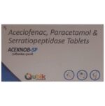 Aceknob-SP Tablet is a combination medicine used to relieve pain and swelling in various conditions like muscle pain, joint pain, and postoperative pain. Thus, it effectively alleviates pain and inflammation in conditions like rheumatoid arthritis, ankylosing spondylitis, and osteoarthritis. Aceknob-SP Tablet should be taken in the dose and duration as advised by your doctor. It should be taken with food or milk to prevent stomach upset. Taking the medicine regularly at the right times increases its effectiveness. It is important to keep taking the medicine regularly until your doctor tells you it is safe to stop.Nausea, vomiting, stomach pain, indigestion, heartburn, increased liver enzymes, dizziness,drowsiness, and diarrhea are some of the common side effects that might be observed on taking this medicine. Your doctor may regularly monitor your kidney function, liver function, and levels of blood components if you are taking this medicine for long-term treatment. Long-term use may lead to serious complications such as stomach bleeding and kidney problems. Aceknob-SP Tablet is not recommended if you are pregnant or breastfeeding.