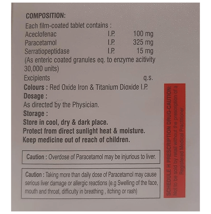 Aceclofenac (100mg) + Paracetamol (325mg) + Serratiopeptidase (15mg):<packagingdetail>:Strip: