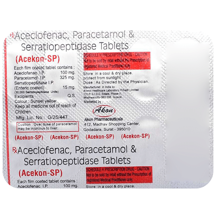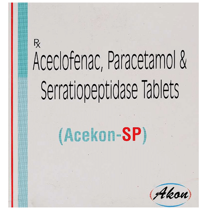 What is Acekon-SP Tablet?::: It is a combination of three medicines: Aceclofenac, Paracetamol, and Serratiopeptidase. This medication helps in relieving pain and inflammation. It works by lowering the levels of chemical substances in the body that cause pain and inflammation.| Is it safe to take Acekon-SP Tablet?::: It is safe to take this medicine for most of the patients. However, in some patients, it may cause unwanted side effects like nausea, vomiting, stomach pain, heartburn, and diarrhea. If you experience any persistent problem due to the medication, inform your doctor as soon as possible.| Can I stop taking Acekon-SP Tablet when my pain is relieved?::: This medicine is usually used for the short term and can be discontinued when your pain is relieved. However, continued taking it if your doctor has advised you to do so.| Can Acekon-SP Tablet cause nausea and vomiting?::: Yes, the use of this medicine can cause nausea and vomiting. In case you experience nausea while taking this medicine, take it with milk, food, or with antacids. Avoid taking fatty or fried foods along with this medication. In case of vomiting, drink plenty of water or other fluids by taking small frequent sips. Talk to your doctor if vomiting persists and you notice signs of dehydration, like dark colored and strong-smelling urine and a low frequency of urination. Do not take any other medicines without speaking to your doctor.| Can Acekon-SP Tablet cause dizziness?::: Yes, the use of this medicine can cause dizziness (feeling faint, weak, unsteady or lightheaded) in some patients. If you feel dizzy or lightheaded, it is better to rest for sometime and resume once you feel better.| Are there any specific contraindications associated with taking Acekon-SP Tablet?::: The use of this medicine is considered harmful for patients with known allergy to any of the components or excipients of this medicine or in patients with known allergy to other painkillers (NSAIDs). Its use should preferably be avoided in patients with a history of stomach ulcers or in patients with active, recurrent stomach ulcers/bleeding. It should also be avoided in patients with a history of heart failure, high blood pressure, and liver or kidney disease.| Can I take Acekon-SP Tablet with vitamin B-complex?::: Yes, this medicine can be taken with vitamin B-complex preparations. While it helps to relieve pain, vitamin B-complex can help to correct the vitamin deficiency that might be causing your symptoms.| Can the use of Acekon-SP Tablet cause damage to kidneys?::: Yes, long-term use of this medicine can cause damage to the kidneys. Normal kidneys produce a chemical called prostaglandins that protect them from damage. The use of painkillers lowers the levels of prostaglandins in the body, which leads to kidney damage on long-term use. The use of painkillers is not recommended in patients with underlying kidney disease.| Can I take a higher dose of Acekon-SP Tablet than recommended?::: No, taking a higher than recommended dose can lead to increased chances of side effects. If you are experiencing increased severity of pain or the pain is not relieved by the recommended doses, please consult your doctor for re-evaluation.| What are the instructions for storage and disposal of Acekon-SP Tablet?::: Keep this medicine in the packet or the container it came in, tightly closed. Store it according to the instructions mentioned on the pack or label. Dispose of the unused medicine. Make sure it is not consumed by pets, children and other people.: