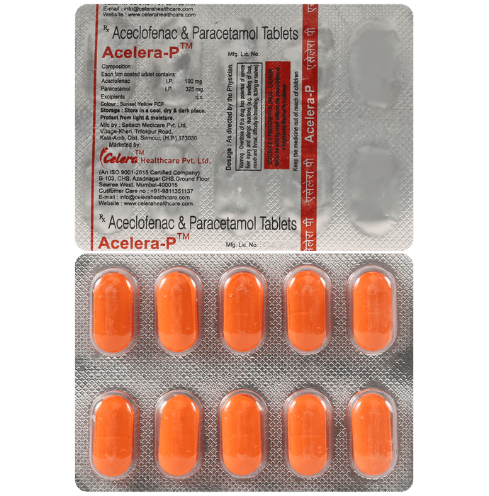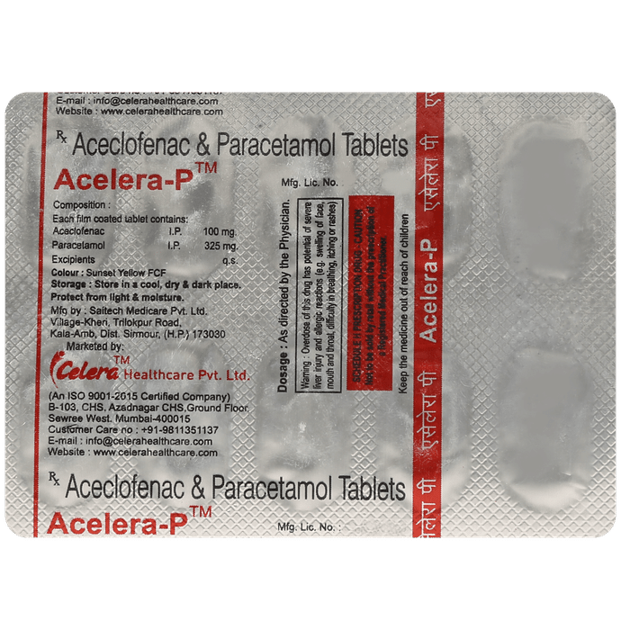 What is Acelera-P Tablet?::: Acelera-P Tablet is a combination of two medicines: Aceclofenac and Paracetamol. This medication helps in relieving pain and inflammation. It works by lowering the levels of chemical substances in the body that cause pain and inflammation.| Is it safe to use Acelera-P Tablet?::: Acelera-P Tablet is safe for most of the patients. However, in some patients it may cause some unwanted common side effects like nausea, vomiting, stomach pain, heartburn, diarrhea and other uncommon and rare side effects.| Can I stop taking Acelera-P Tablet when my pain is relieved?::: If you are using the medication for a condition associated with long-term pain then Acelera-P Tablet should be continued for as long as advised by your physician. It can be discontinued if you are using it for short-term pain relief.| Can the use of Acelera-P Tablet cause nausea and vomiting?::: Yes, the use of Acelera-P Tablet can cause nausea and vomiting. Taking it with milk, food or with antacids can prevent nausea. Avoid taking fatty or fried foods along with this medication. In case of vomiting drink plenty of water or other fluids by taking small frequent sips. Talk to your doctor if vomiting persists and you notice signs of dehydration, like dark colored and strong-smelling urine and a low frequency of urination. Do not take any other medicine without speaking to your doctor.| Can the use of Acelera-P Tablet cause dizziness?::: Yes, the use of Acelera-P Tablet can cause dizziness (feeling faint, weak, unsteady or lightheaded) in some patients. If you feel dizzy or lightheaded, it is better to rest for sometime and resume once you feel better.| Are there any specific contraindications associated with the use of Acelera-P Tablet?::: The use of Acelera-P Tablet is considered to be harmful for patients with known allergy to any of the components or excipients of this medicine or in patients with known allergy to other painkillers (NSAIDs). It should preferably be avoided in patients with a history of stomach ulcers or in patients with active, recurrent stomach ulcer/bleeding. It should also be avoided in patients with a history of heart failure, high blood pressure, and liver or kidney disease.| Can Acelera-P Tablet be taken with vitamin B-complex?::: Yes, Acelera-P Tablet can be taken with vitamin B-complex preparations. While Acelera-P Tablet helps to relieve pain, vitamin B-complex can help to correct the vitamin deficiency that might be causing the underlying painful condition.| Is Acelera-P Tablet helpful in relieving stomach pain?::: No, Acelera-P Tablet preferably should not be taken for stomach pain without consulting a physician. This drug can increase stomach acid secretion which may aggravate an unknown underlying condition.| Can the use of Acelera-P Tablet cause damage to kidneys?::: Yes, the long-term use of Acelera-P Tablet can cause damage to the kidneys. Normal kidneys produce a chemical messenger called prostaglandins that protects them from damage. Use of painkillers lowers the levels of prostaglandins in the body which leads to kidney damage on long-term use. Use of painkillers is not recommended to patients with underlying kidney disease.| Is it safe to take a higher dose of Acelera-P Tablet than recommended?::: No, taking higher than the recommended dose of Acelera-P Tablet can lead to increased chances of side effects like nausea, vomiting, heartburn, indigestion, diarrhea and can also damage your kidneys on long-term use. If you are experiencing increased severity of pain or if the pain is not relieved by the recommended doses of this medicine, please consult your doctor for re-evaluation.| What are the instructions for storage and disposal of Acelera-P Tablet?::: Keep this medicine in the container or the pack it came in, tightly closed. Store it according to the instructions mentioned on the pack or label. Dispose of the unused medicine. Make sure it is not consumed by pets, children and other people.| How long does it take for Acelera-P Tablet to show results?::: The effect of Acelera-P Tablet can be seen within 1.5 to 3 hours of oral administration of the medicine and the time taken to show the desired effects may vary with every individual patient.| What is the dosage of Acelera-P Tablet?::: You may take one tablet of Acelera-P Tablet twice daily or as prescribed by your doctor. Always follow your doctor’s instructions while taking this medicine.| Can I take Acelera-P Tablet along with other painkiller tablets?::: No, it is not recommended to take Acelera-P Tablet with other painkiller medicines without consulting your doctor since it may cause unwanted side effects like stomach pain or ulcers.| Can Acelera-P Tablet be given to children?::: No, Acelera-P Tablet is not recommended for use in children under the age of 18 years.: