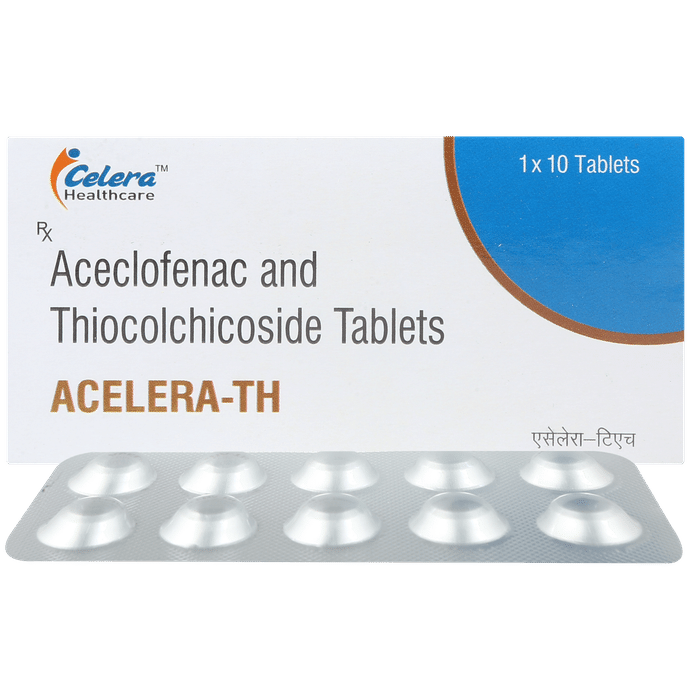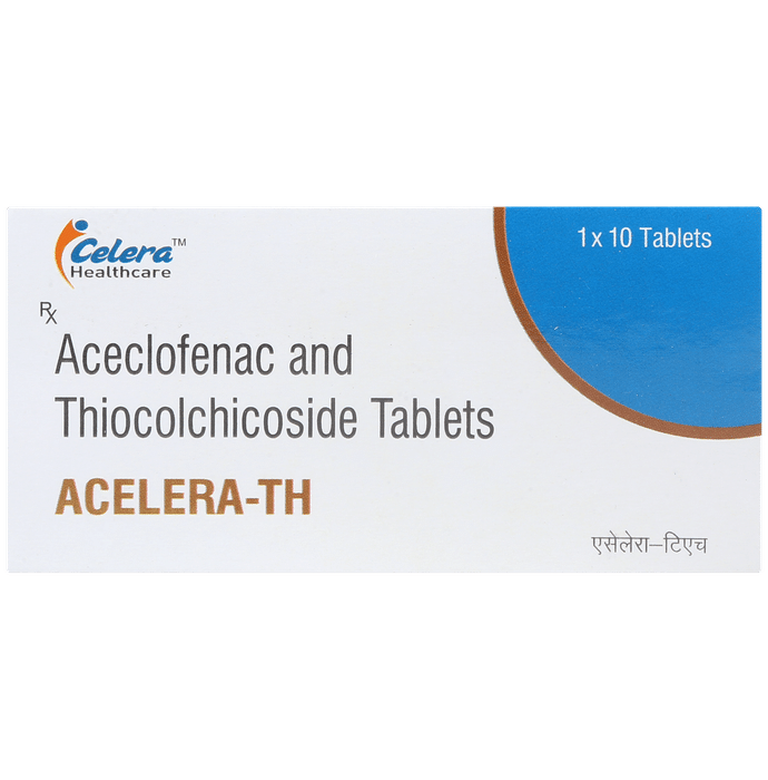 What is Acelera-TH Tablet?::: Acelera-TH Tablet is a combination of two medicines: Aceclofenac and Thiocolchicoside. This medication helps in relieving muscle pain. It relaxes the muscles by acting on the central nervous system and lowering chemical substance in the body that cause pain and inflammation.| Is it safe to use Acelera-TH Tablet?::: Yes, Acelera-TH Tablet is safe for most of the patients. However, in some patients it may cause some common unwanted side effects like nausea, vomiting, stomach pain, heartburn, diarrhoea and other uncommon and rare side effects. Inform your doctor if you experience any persistent problem due to the medication.| Can the Acelera-TH Tablet be stopped when my pain is relieved?::: Acelera-TH Tablet is usually used for short term and can be discontinued when the pain is relieved. However, Acelera-TH Tablet should be continued if your doctor has advised you to do so.| Can the use of Acelera-TH Tablet cause dizziness?::: Yes, the use of Acelera-TH Tablet can cause dizziness (feeling faint, weak, unsteady or lightheaded) in some patients. If you feel dizzy or lightheaded, it is better to rest for some time and resume once you feel better.| Are there any specific contraindications associated with the use of Acelera-TH Tablet?::: The use of Acelera-TH Tablet is considered to be harmful for patients with known allergy to painkillers or any of the components or excipients of this medicine. The use of this medicine should preferably be avoided in patients with a history of stomach ulcer or in patients with active, recurrent stomach ulcer/bleeding. It should also be avoided in patients with history of heart failure, high blood pressure, and liver or kidney disease.| Can Acelera-TH Tablet be taken with Vitamin B-complex?::: Yes, Acelera-TH Tablet can be taken with Vitamin B-complex preparations. While Acelera-TH Tablet helps to relieve pain, Vitamin B-complex can help to correct the vitamin deficiency that might be causing your symptoms.| Can the use of Acelera-TH Tablet cause damage to kidneys?::: Yes, the long-term use of Acelera-TH Tablet can cause damage to the kidneys. Normal kidneys produce a chemical called prostaglandins that protects them from damage. Use of painkillers lower the levels of prostaglandins in the body which leads to kidney damage on long-term use. Use of painkillers is not recommended in patients with underlying kidney disease.| Will Acelera-TH Tablet be more effective if taken in higher doses?::: No, taking more of this medicine will not make it more effective, rather it can lead to increased side effects. If the symptoms are getting severe, please consult the doctor for re-evaluation.: