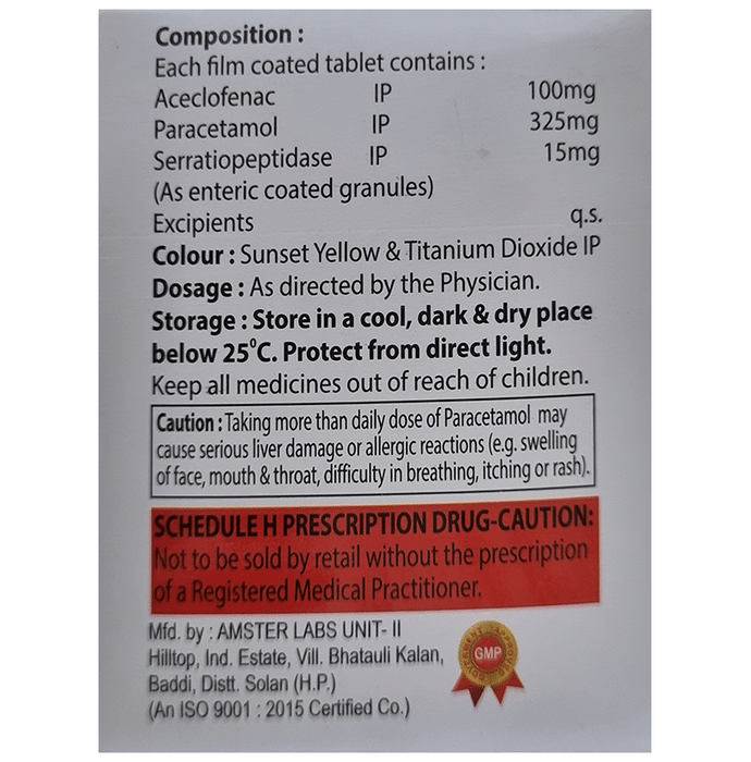 Aceclofenac (100mg) + Paracetamol (325mg) + Serratiopeptidase (15mg):<packagingdetail>:Strip: