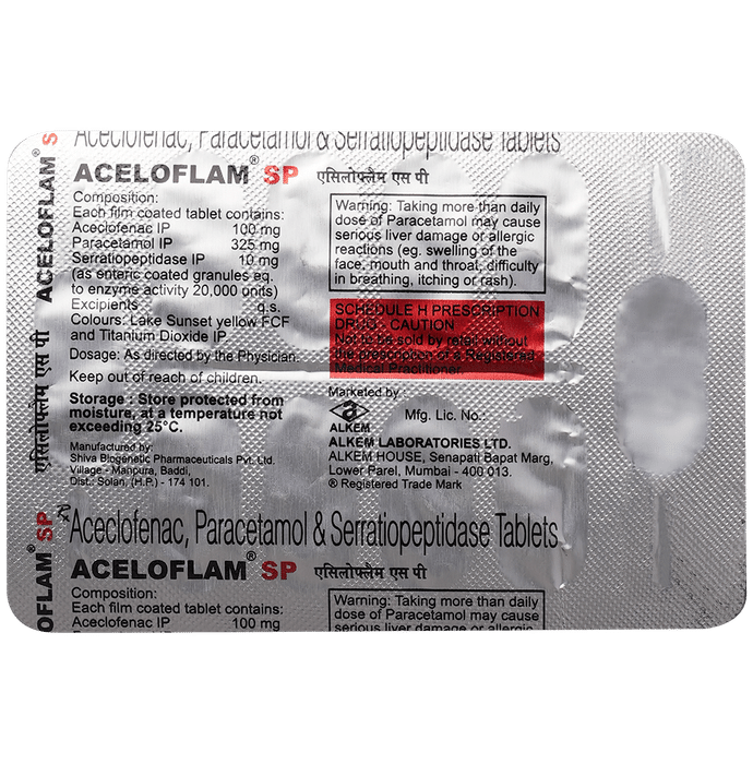 What is Aceloflam SP Tablet?::: It is a combination of three medicines: Aceclofenac, Paracetamol, and Serratiopeptidase. This medication helps in relieving pain and inflammation. It works by lowering the levels of chemical substances in the body that cause pain and inflammation.| Is it safe to take Aceloflam SP Tablet?::: It is safe to take this medicine for most of the patients. However, in some patients, it may cause unwanted side effects like nausea, vomiting, stomach pain, heartburn, and diarrhea. If you experience any persistent problem due to the medication, inform your doctor as soon as possible.| Can I stop taking Aceloflam SP Tablet when my pain is relieved?::: This medicine is usually used for the short term and can be discontinued when your pain is relieved. However, continued taking it if your doctor has advised you to do so.| Can Aceloflam SP Tablet cause nausea and vomiting?::: Yes, the use of this medicine can cause nausea and vomiting. In case you experience nausea while taking this medicine, take it with milk, food, or with antacids. Avoid taking fatty or fried foods along with this medication. In case of vomiting, drink plenty of water or other fluids by taking small frequent sips. Talk to your doctor if vomiting persists and you notice signs of dehydration, like dark colored and strong-smelling urine and a low frequency of urination. Do not take any other medicines without speaking to your doctor.| Can Aceloflam SP Tablet cause dizziness?::: Yes, the use of this medicine can cause dizziness (feeling faint, weak, unsteady or lightheaded) in some patients. If you feel dizzy or lightheaded, it is better to rest for sometime and resume once you feel better.| Are there any specific contraindications associated with taking Aceloflam SP Tablet?::: The use of this medicine is considered harmful for patients with known allergy to any of the components or excipients of this medicine or in patients with known allergy to other painkillers (NSAIDs). Its use should preferably be avoided in patients with a history of stomach ulcers or in patients with active, recurrent stomach ulcers/bleeding. It should also be avoided in patients with a history of heart failure, high blood pressure, and liver or kidney disease.| Can I take Aceloflam SP Tablet with vitamin B-complex?::: Yes, this medicine can be taken with vitamin B-complex preparations. While it helps to relieve pain, vitamin B-complex can help to correct the vitamin deficiency that might be causing your symptoms.| Can the use of Aceloflam SP Tablet cause damage to kidneys?::: Yes, long-term use of this medicine can cause damage to the kidneys. Normal kidneys produce a chemical called prostaglandins that protect them from damage. The use of painkillers lowers the levels of prostaglandins in the body, which leads to kidney damage on long-term use. The use of painkillers is not recommended in patients with underlying kidney disease.| Can I take a higher dose of Aceloflam SP Tablet than recommended?::: No, taking a higher than recommended dose can lead to increased chances of side effects. If you are experiencing increased severity of pain or the pain is not relieved by the recommended doses, please consult your doctor for re-evaluation.| What are the instructions for storage and disposal of Aceloflam SP Tablet?::: Keep this medicine in the packet or the container it came in, tightly closed. Store it according to the instructions mentioned on the pack or label. Dispose of the unused medicine. Make sure it is not consumed by pets, children and other people.: