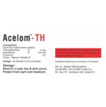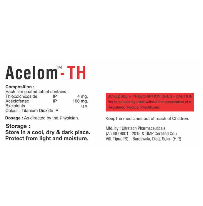 What is Acelom-TH Tablet?::: Acelom-TH Tablet is a combination of two medicines: Aceclofenac and Thiocolchicoside. This medication helps in relieving muscle pain. It relaxes the muscles by acting on the central nervous system and lowering chemical substance in the body that cause pain and inflammation.| Is it safe to use Acelom-TH Tablet?::: Yes, Acelom-TH Tablet is safe for most of the patients. However, in some patients it may cause some common unwanted side effects like nausea, vomiting, stomach pain, heartburn, diarrhoea and other uncommon and rare side effects. Inform your doctor if you experience any persistent problem due to the medication.| Can the Acelom-TH Tablet be stopped when my pain is relieved?::: Acelom-TH Tablet is usually used for short term and can be discontinued when the pain is relieved. However, Acelom-TH Tablet should be continued if your doctor has advised you to do so.| Can the use of Acelom-TH Tablet cause dizziness?::: Yes, the use of Acelom-TH Tablet can cause dizziness (feeling faint, weak, unsteady or lightheaded) in some patients. If you feel dizzy or lightheaded, it is better to rest for some time and resume once you feel better.| Are there any specific contraindications associated with the use of Acelom-TH Tablet?::: The use of Acelom-TH Tablet is considered to be harmful for patients with known allergy to painkillers or any of the components or excipients of this medicine. The use of this medicine should preferably be avoided in patients with a history of stomach ulcer or in patients with active, recurrent stomach ulcer/bleeding. It should also be avoided in patients with history of heart failure, high blood pressure, and liver or kidney disease.| Can Acelom-TH Tablet be taken with Vitamin B-complex?::: Yes, Acelom-TH Tablet can be taken with Vitamin B-complex preparations. While Acelom-TH Tablet helps to relieve pain, Vitamin B-complex can help to correct the vitamin deficiency that might be causing your symptoms.| Can the use of Acelom-TH Tablet cause damage to kidneys?::: Yes, the long-term use of Acelom-TH Tablet can cause damage to the kidneys. Normal kidneys produce a chemical called prostaglandins that protects them from damage. Use of painkillers lower the levels of prostaglandins in the body which leads to kidney damage on long-term use. Use of painkillers is not recommended in patients with underlying kidney disease.| Will Acelom-TH Tablet be more effective if taken in higher doses?::: No, taking more of this medicine will not make it more effective, rather it can lead to increased side effects. If the symptoms are getting severe, please consult the doctor for re-evaluation.: