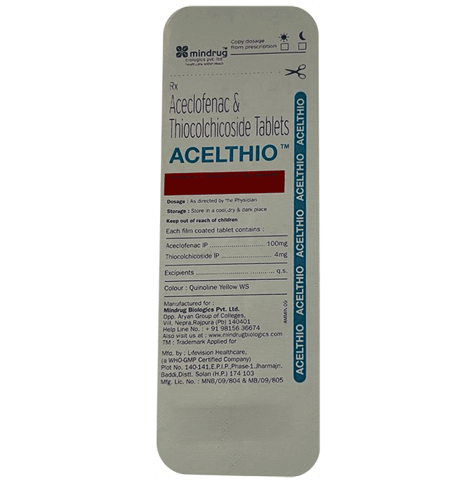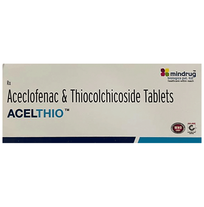 In Treatment of Pain due to muscle spasm Acelthio Tablet is a combination medicine that contains a painkiller as well as a muscle relaxant. It is used to relieve pain, inflammation, and swelling in conditions that affect muscles. Also, it effectively relieves muscle stiffness or spasm, thereby improving muscle movement. It works by blocking chemical messengers in the brain that tell us we have pain.u003cbr>u003cbr>Take it as it is prescribed to get the most benefit. Do not take more or for a longer duration than needed as that can be dangerous. In general, you should take the lowest dose that works, for the shortest possible time. This will help you to go about your daily activities more easily and have a better, more active, quality of life.