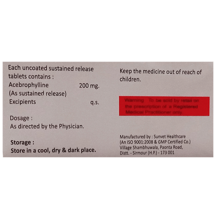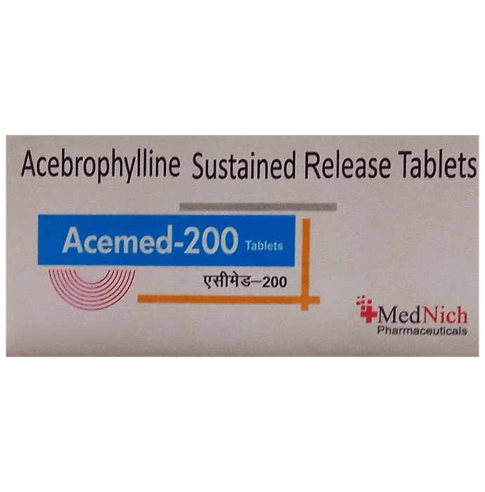 Does birth control pills have any effect on Acemed 200 Tablet SR?::: If you are taking birth control pills, dose of Acemed 200 Tablet SR need to be reduced as birth control pills may interfere with clearance of Acemed 200 Tablet SR, increasing its levels and chances of side effects.| How should Acemed 200 Tablet SR be taken?::: Acemed 200 Tablet SR should be taken strictly as advised by the doctor. To avoid an upset stomach it should be taken with food. | Is it okay to take furosemide along with Acemed 200 Tablet SR?::: One should take proper caution if you are taking furosemide along with Acemed 200 Tablet SR. This is because the combined use of these medicines may decrease the levels of potassium. Hence, regular monitoring of potassium levels is required.| When should Acemed 200 Tablet SR be avoided?::: Acemed 200 Tablet SR should be avoided in patients who are allergic to ambroxol, Acemed 200 Tablet SR, or theophylline. Along with that, patients suffering from low blood pressure, irregular heart beats or rhythm or history of heart attack, liver disease or kidney disorder should avoid taking Acemed 200 Tablet SR.| Is Acemed 200 Tablet SR the same as theophylline?::: Acemed 200 Tablet SR comprises of theophylline-7 acetate and ambroxol which makes it effective in making the mucus more fluid and clearing the airways easily, thereby making breathing easier. This effect of Acemed 200 Tablet SR works as an added advantage over theophylline. Moreover, it also reduces the need for other medicine used to treat asthma, like salbutamol.: