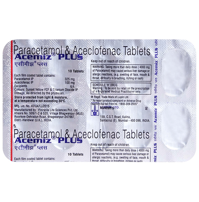 What is Acemiz Plus Tablet?::: Acemiz Plus Tablet is a combination of two medicines: Aceclofenac and Paracetamol. This medication helps in relieving pain and inflammation. It works by lowering the levels of chemical substances in the body that cause pain and inflammation.| Is it safe to use Acemiz Plus Tablet?::: Acemiz Plus Tablet is safe for most of the patients. However, in some patients it may cause some unwanted common side effects like nausea, vomiting, stomach pain, heartburn, diarrhea and other uncommon and rare side effects.| Can I stop taking Acemiz Plus Tablet when my pain is relieved?::: If you are using the medication for a condition associated with long-term pain then Acemiz Plus Tablet should be continued for as long as advised by your physician. It can be discontinued if you are using it for short-term pain relief.| Can the use of Acemiz Plus Tablet cause nausea and vomiting?::: Yes, the use of Acemiz Plus Tablet can cause nausea and vomiting. Taking it with milk, food or with antacids can prevent nausea. Avoid taking fatty or fried foods along with this medication. In case of vomiting drink plenty of water or other fluids by taking small frequent sips. Talk to your doctor if vomiting persists and you notice signs of dehydration, like dark colored and strong-smelling urine and a low frequency of urination. Do not take any other medicine without speaking to your doctor.| Can the use of Acemiz Plus Tablet cause dizziness?::: Yes, the use of Acemiz Plus Tablet can cause dizziness (feeling faint, weak, unsteady or lightheaded) in some patients. If you feel dizzy or lightheaded, it is better to rest for sometime and resume once you feel better.| Are there any specific contraindications associated with the use of Acemiz Plus Tablet?::: The use of Acemiz Plus Tablet is considered to be harmful for patients with known allergy to any of the components or excipients of this medicine or in patients with known allergy to other painkillers (NSAIDs). It should preferably be avoided in patients with a history of stomach ulcers or in patients with active, recurrent stomach ulcer/bleeding. It should also be avoided in patients with a history of heart failure, high blood pressure, and liver or kidney disease.| Can Acemiz Plus Tablet be taken with vitamin B-complex?::: Yes, Acemiz Plus Tablet can be taken with vitamin B-complex preparations. While Acemiz Plus Tablet helps to relieve pain, vitamin B-complex can help to correct the vitamin deficiency that might be causing the underlying painful condition.| Is Acemiz Plus Tablet helpful in relieving stomach pain?::: No, Acemiz Plus Tablet preferably should not be taken for stomach pain without consulting a physician. This drug can increase stomach acid secretion which may aggravate an unknown underlying condition.| Can the use of Acemiz Plus Tablet cause damage to kidneys?::: Yes, the long-term use of Acemiz Plus Tablet can cause damage to the kidneys. Normal kidneys produce a chemical messenger called prostaglandins that protects them from damage. Use of painkillers lowers the levels of prostaglandins in the body which leads to kidney damage on long-term use. Use of painkillers is not recommended to patients with underlying kidney disease.| Is it safe to take a higher dose of Acemiz Plus Tablet than recommended?::: No, taking higher than the recommended dose of Acemiz Plus Tablet can lead to increased chances of side effects like nausea, vomiting, heartburn, indigestion, diarrhea and can also damage your kidneys on long-term use. If you are experiencing increased severity of pain or if the pain is not relieved by the recommended doses of this medicine, please consult your doctor for re-evaluation.| What are the instructions for storage and disposal of Acemiz Plus Tablet?::: Keep this medicine in the container or the pack it came in, tightly closed. Store it according to the instructions mentioned on the pack or label. Dispose of the unused medicine. Make sure it is not consumed by pets, children and other people.| How long does it take for Acemiz Plus Tablet to show results?::: The effect of Acemiz Plus Tablet can be seen within 1.5 to 3 hours of oral administration of the medicine and the time taken to show the desired effects may vary with every individual patient.| What is the dosage of Acemiz Plus Tablet?::: You may take one tablet of Acemiz Plus Tablet twice daily or as prescribed by your doctor. Always follow your doctor’s instructions while taking this medicine.| Can I take Acemiz Plus Tablet along with other painkiller tablets?::: No, it is not recommended to take Acemiz Plus Tablet with other painkiller medicines without consulting your doctor since it may cause unwanted side effects like stomach pain or ulcers.| Can Acemiz Plus Tablet be given to children?::: No, Acemiz Plus Tablet is not recommended for use in children under the age of 18 years.: