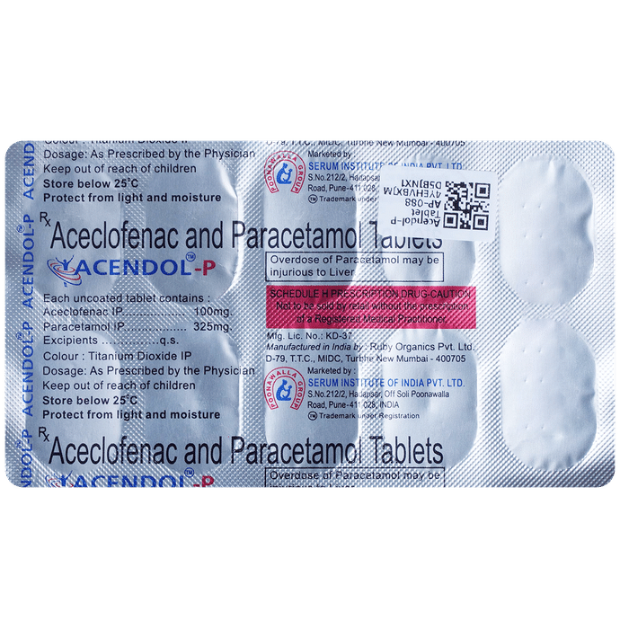 What is Acendol-P Tablet?::: Acendol-P Tablet is a combination of two medicines: Aceclofenac and Paracetamol. This medication helps in relieving pain and inflammation. It works by lowering the levels of chemical substances in the body that cause pain and inflammation.| Is it safe to use Acendol-P Tablet?::: Acendol-P Tablet is safe for most of the patients. However, in some patients it may cause some unwanted common side effects like nausea, vomiting, stomach pain, heartburn, diarrhea and other uncommon and rare side effects.| Can I stop taking Acendol-P Tablet when my pain is relieved?::: If you are using the medication for a condition associated with long-term pain then Acendol-P Tablet should be continued for as long as advised by your physician. It can be discontinued if you are using it for short-term pain relief.| Can the use of Acendol-P Tablet cause nausea and vomiting?::: Yes, the use of Acendol-P Tablet can cause nausea and vomiting. Taking it with milk, food or with antacids can prevent nausea. Avoid taking fatty or fried foods along with this medication. In case of vomiting drink plenty of water or other fluids by taking small frequent sips. Talk to your doctor if vomiting persists and you notice signs of dehydration, like dark colored and strong-smelling urine and a low frequency of urination. Do not take any other medicine without speaking to your doctor.| Can the use of Acendol-P Tablet cause dizziness?::: Yes, the use of Acendol-P Tablet can cause dizziness (feeling faint, weak, unsteady or lightheaded) in some patients. If you feel dizzy or lightheaded, it is better to rest for sometime and resume once you feel better.| Are there any specific contraindications associated with the use of Acendol-P Tablet?::: The use of Acendol-P Tablet is considered to be harmful for patients with known allergy to any of the components or excipients of this medicine or in patients with known allergy to other painkillers (NSAIDs). It should preferably be avoided in patients with a history of stomach ulcers or in patients with active, recurrent stomach ulcer/bleeding. It should also be avoided in patients with a history of heart failure, high blood pressure, and liver or kidney disease.| Can Acendol-P Tablet be taken with vitamin B-complex?::: Yes, Acendol-P Tablet can be taken with vitamin B-complex preparations. While Acendol-P Tablet helps to relieve pain, vitamin B-complex can help to correct the vitamin deficiency that might be causing the underlying painful condition.| Is Acendol-P Tablet helpful in relieving stomach pain?::: No, Acendol-P Tablet preferably should not be taken for stomach pain without consulting a physician. This drug can increase stomach acid secretion which may aggravate an unknown underlying condition.| Can the use of Acendol-P Tablet cause damage to kidneys?::: Yes, the long-term use of Acendol-P Tablet can cause damage to the kidneys. Normal kidneys produce a chemical messenger called prostaglandins that protects them from damage. Use of painkillers lowers the levels of prostaglandins in the body which leads to kidney damage on long-term use. Use of painkillers is not recommended to patients with underlying kidney disease.| Is it safe to take a higher dose of Acendol-P Tablet than recommended?::: No, taking higher than the recommended dose of Acendol-P Tablet can lead to increased chances of side effects like nausea, vomiting, heartburn, indigestion, diarrhea and can also damage your kidneys on long-term use. If you are experiencing increased severity of pain or if the pain is not relieved by the recommended doses of this medicine, please consult your doctor for re-evaluation.| What are the instructions for storage and disposal of Acendol-P Tablet?::: Keep this medicine in the container or the pack it came in, tightly closed. Store it according to the instructions mentioned on the pack or label. Dispose of the unused medicine. Make sure it is not consumed by pets, children and other people.| How long does it take for Acendol-P Tablet to show results?::: The effect of Acendol-P Tablet can be seen within 1.5 to 3 hours of oral administration of the medicine and the time taken to show the desired effects may vary with every individual patient.| What is the dosage of Acendol-P Tablet?::: You may take one tablet of Acendol-P Tablet twice daily or as prescribed by your doctor. Always follow your doctor’s instructions while taking this medicine.| Can I take Acendol-P Tablet along with other painkiller tablets?::: No, it is not recommended to take Acendol-P Tablet with other painkiller medicines without consulting your doctor since it may cause unwanted side effects like stomach pain or ulcers.| Can Acendol-P Tablet be given to children?::: No, Acendol-P Tablet is not recommended for use in children under the age of 18 years.: