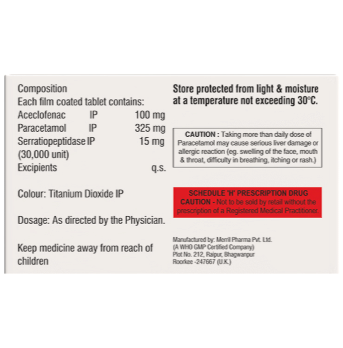 Aceclofenac (100mg) + Paracetamol (325mg) + Serratiopeptidase (15mg):<packagingdetail>:Strip: