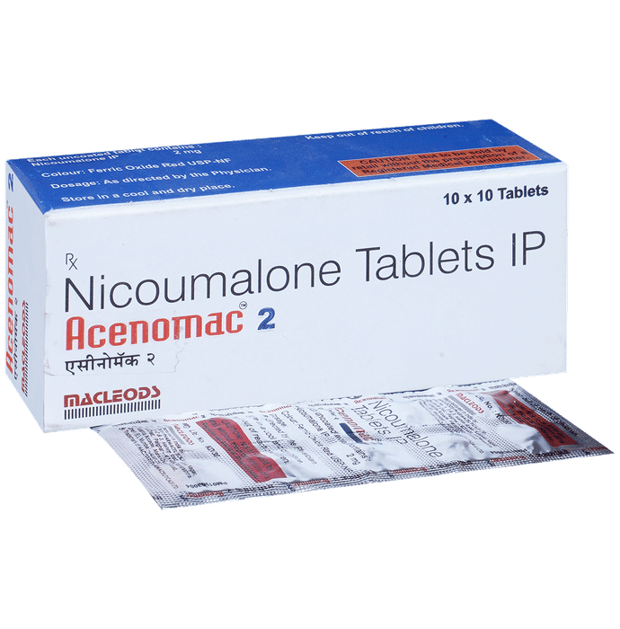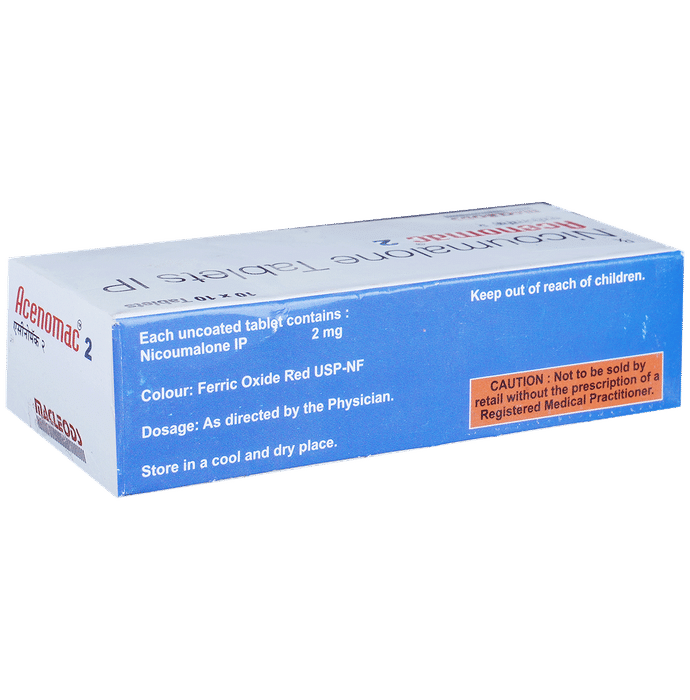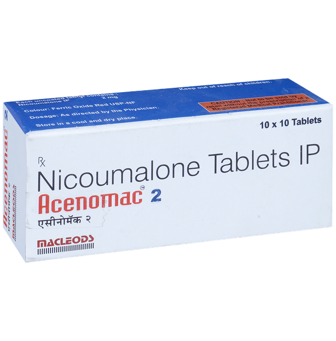 How long do I need to take Acenomac 2 Tablet?::: You should continue taking Acenomac 2 Tablet for as long as recommended by your doctor. Depending upon the condition you are being treated for, you may have to take it for several months or years or maybe for the rest of your life.| What should I avoid while taking Acenomac 2 Tablet?::: You should avoid alcohol while taking Acenomac 2 Tablet as alcohol may interfere with working of Acenomac 2 Tablet. In addition to that, avoid cranberry juice or other cranberry products as there may be a risk of enhanced blood thinning. Avoid breastfeeding or getting pregnant as it may harm your child.| Do I need to stop Acenomac 2 Tablet if I have to undergo a surgery?::: Depending on the type of surgery that is to be performed, your doctor will tell you whether to continue or stop Acenomac 2 Tablet. It will be decided by your doctor after weighing the risks and benefits of discontinuing Acenomac 2 Tablet.| Is Acenomac 2 Tablet same as warfarin?::: Both Acenomac 2 Tablet and warfarin are blood thinners, but they have some differences. Warfarin has a more stable blood thinning effect.| How long does it take for Acenomac 2 Tablet to start working?::: It takes a little longer for Acenomac 2 Tablet to start working. On an average, it may take 2-3 days for Acenomac 2 Tablet to show its blood-thinning effect. For these 2-3 days, heparin may be used and then discontinued.| What if I forget to take a dose?::: If you forget to take a dose of Acenomac 2 Tablet, take it as soon as you remember. However, if it is time for your next dose then skip the missed dose. Do not double the dose and continue your normal schedule. Keep a diary or set a reminder, so that you do not forget it often.| What monitoring is required while taking Acenomac 2 Tablet?::: The bleeding times should be carefully monitored from 2nd or 3rd dose of Acenomac 2 Tablet and till the clotting status is stabilized. Thereafter, the bleeding time can be monitored monthly. This frequency may be more in elderly.: