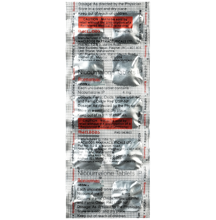 How long do I need to take Acenomac 4mg Tablet?::: You should continue taking Acenomac 4mg Tablet for as long as recommended by your doctor. Depending upon the condition you are being treated for, you may have to take it for several months or years or maybe for the rest of your life.| What should I avoid while taking Acenomac 4mg Tablet?::: You should avoid alcohol while taking Acenomac 4mg Tablet as alcohol may interfere with working of Acenomac 4mg Tablet. In addition to that, avoid cranberry juice or other cranberry products as there may be a risk of enhanced blood thinning. Avoid breastfeeding or getting pregnant as it may harm your child.| Do I need to stop Acenomac 4mg Tablet if I have to undergo a surgery?::: Depending on the type of surgery that is to be performed, your doctor will tell you whether to continue or stop Acenomac 4mg Tablet. It will be decided by your doctor after weighing the risks and benefits of discontinuing Acenomac 4mg Tablet.| Is Acenomac 4mg Tablet same as warfarin?::: Both Acenomac 4mg Tablet and warfarin are blood thinners, but they have some differences. Warfarin has a more stable blood thinning effect.| How long does it take for Acenomac 4mg Tablet to start working?::: It takes a little longer for Acenomac 4mg Tablet to start working. On an average, it may take 2-3 days for Acenomac 4mg Tablet to show its blood-thinning effect. For these 2-3 days, heparin may be used and then discontinued.| What if I forget to take a dose?::: If you forget to take a dose of Acenomac 4mg Tablet, take it as soon as you remember. However, if it is time for your next dose then skip the missed dose. Do not double the dose and continue your normal schedule. Keep a diary or set a reminder, so that you do not forget it often.| What monitoring is required while taking Acenomac 4mg Tablet?::: The bleeding times should be carefully monitored from 2nd or 3rd dose of Acenomac 4mg Tablet and till the clotting status is stabilized. Thereafter, the bleeding time can be monitored monthly. This frequency may be more in elderly.: