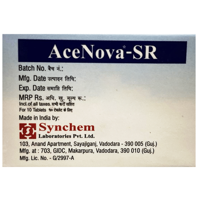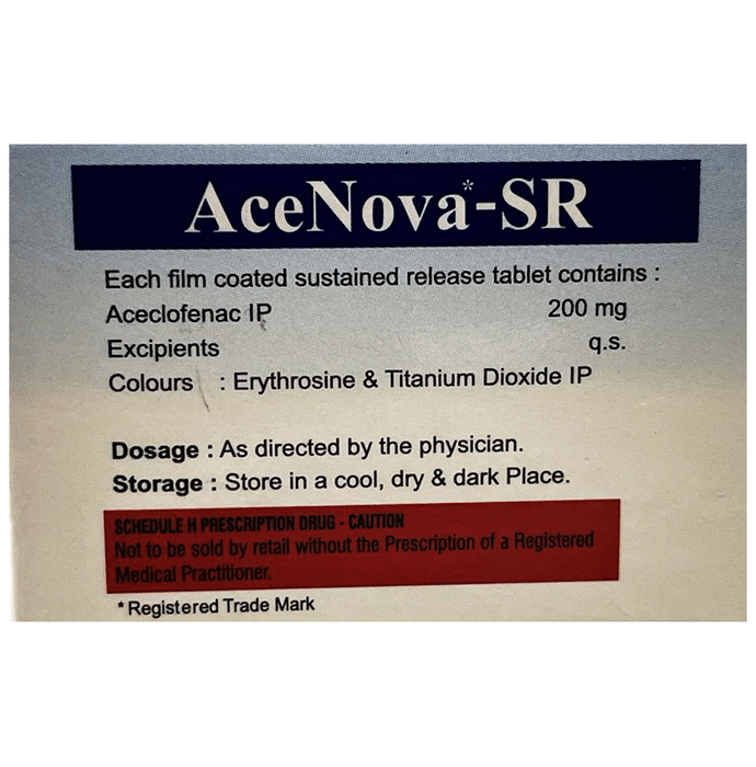 Is Acenova-SR Tablet a good painkiller?::: Acenova-SR Tablet is effective in relieving pain and inflammation. It is used to provide relief from various sorts of pain such as sprains, strains and other injuries. It is also helpful in various types of arthritis, gout, pain and inflammation following surgery.| Is Acenova-SR Tablet safe?::: Acenova-SR Tablet is safe if used in the dose and duration advised by your doctor. Take it exactly as directed and do not skip any dose. Follow your doctor’s instructions carefully and let your doctor know if any of the side effects bother you.| Does Acenova-SR Tablet get you high?::: No, Acenova-SR Tablet does not get you high. It does not have an abuse potential (drug-seeking behavior) and does not cause physical or psychological dependence. However, if you do not feel well, consult your doctor.| Can Acenova-SR Tablet hurt your kidneys?::: Long-term use and high doses of Acenova-SR Tablet may cause renal problems, such as protein or blood in urine and pain during urination. Patients who had or have heart failure, impaired kidney function and hypertension are at risk of kidney problems. The risk of developing kidney problems is also high in patients who are on medicines which cause excess urination (diuretics), or medicines which have significant impact on kidney function. Along with that, Acenova-SR Tablet can affect kidneys of patients who are above 65 years of age or who remain dehydrated. Therefore, kidney function monitoring is recommended for such patients.| What if I forget to take a dose of Acenova-SR Tablet?::: If you forget a dose of Acenova-SR Tablet, take it as soon as you remember. However, if it is almost time for your next dose, skip the missed dose and take the next scheduled dose in the prescribed time. Do not double the dose to make up for the missed one as this may increase the chances of developing side effects.| Does Acenova-SR Tablet make you drowsy?::: Acenova-SR Tablet can cause drowsiness and also dizziness, fatigue (tiredness) and visual disturbances. However, it is not very common and may not affect everyone. If you experience these symptoms avoid driving or operating heavy machinery.| What is the most important information I need to know about Acenova-SR Tablet?::: It is important to know that Acenova-SR Tablet may increase your chance of having a heart attack or stroke. The risk is more if you take higher doses and have been using the medicine for a longer time. Also, the use of Acenova-SR Tablet may cause ulcers, bleeding, or holes in your stomach and intestine. These problems may happen without warning symptoms at any time during treatment and may even cause death. Therefore, if you encounter any such problems, consult your doctor immediately.| Can Acenova-SR Tablet be taken during pregnancy?::: You should not take Acenova-SR Tablet during the last 3 months of pregnancy as it may cause harmful effects on your baby. Use of Acenova-SR Tablet can also lead to reduced labor (premature delivery). Hence, it is advised to avoid using Acenova-SR Tablet during the first 6 months of pregnancy also. In some cases, Acenova-SR Tablet may be prescribed in pregnant women only if the benefits outweigh the risks involved with its use in pregnant women. If not sure, consult your doctor regarding its use.| Is Acenova-SR Tablet effective?::: Acenova-SR Tablet is effective if used in the dose and duration advised by your doctor. Do not stop taking it even if you see improvement in your condition. If you stop using Acenova-SR Tablet too early, the symptoms may return or worsen.: