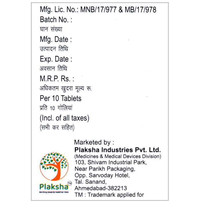 Prescription Required:Plaksha Industries Pvt.Ltd.:<medicine_type>: