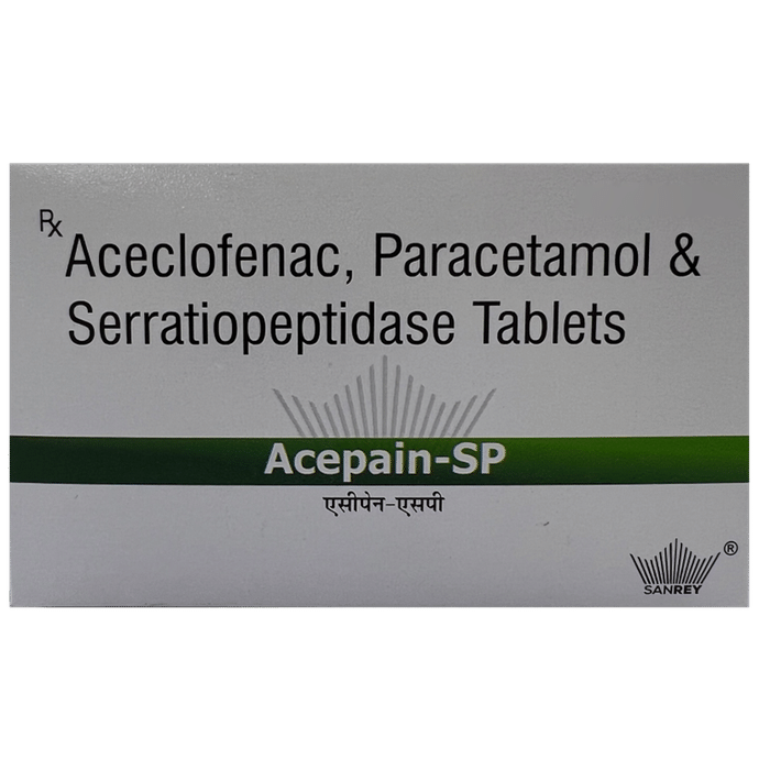 What is Acepain-SP Tablet?::: It is a combination of three medicines: Aceclofenac, Paracetamol, and Serratiopeptidase. This medication helps in relieving pain and inflammation. It works by lowering the levels of chemical substances in the body that cause pain and inflammation.| Is it safe to take Acepain-SP Tablet?::: It is safe to take this medicine for most of the patients. However, in some patients, it may cause unwanted side effects like nausea, vomiting, stomach pain, heartburn, and diarrhea. If you experience any persistent problem due to the medication, inform your doctor as soon as possible.| Can I stop taking Acepain-SP Tablet when my pain is relieved?::: This medicine is usually used for the short term and can be discontinued when your pain is relieved. However, continued taking it if your doctor has advised you to do so.| Can Acepain-SP Tablet cause nausea and vomiting?::: Yes, the use of this medicine can cause nausea and vomiting. In case you experience nausea while taking this medicine, take it with milk, food, or with antacids. Avoid taking fatty or fried foods along with this medication. In case of vomiting, drink plenty of water or other fluids by taking small frequent sips. Talk to your doctor if vomiting persists and you notice signs of dehydration, like dark colored and strong-smelling urine and a low frequency of urination. Do not take any other medicines without speaking to your doctor.| Can Acepain-SP Tablet cause dizziness?::: Yes, the use of this medicine can cause dizziness (feeling faint, weak, unsteady or lightheaded) in some patients. If you feel dizzy or lightheaded, it is better to rest for sometime and resume once you feel better.| Are there any specific contraindications associated with taking Acepain-SP Tablet?::: The use of this medicine is considered harmful for patients with known allergy to any of the components or excipients of this medicine or in patients with known allergy to other painkillers (NSAIDs). Its use should preferably be avoided in patients with a history of stomach ulcers or in patients with active, recurrent stomach ulcers/bleeding. It should also be avoided in patients with a history of heart failure, high blood pressure, and liver or kidney disease.| Can I take Acepain-SP Tablet with vitamin B-complex?::: Yes, this medicine can be taken with vitamin B-complex preparations. While it helps to relieve pain, vitamin B-complex can help to correct the vitamin deficiency that might be causing your symptoms.| Can the use of Acepain-SP Tablet cause damage to kidneys?::: Yes, long-term use of this medicine can cause damage to the kidneys. Normal kidneys produce a chemical called prostaglandins that protect them from damage. The use of painkillers lowers the levels of prostaglandins in the body, which leads to kidney damage on long-term use. The use of painkillers is not recommended in patients with underlying kidney disease.| Can I take a higher dose of Acepain-SP Tablet than recommended?::: No, taking a higher than recommended dose can lead to increased chances of side effects. If you are experiencing increased severity of pain or the pain is not relieved by the recommended doses, please consult your doctor for re-evaluation.| What are the instructions for storage and disposal of Acepain-SP Tablet?::: Keep this medicine in the packet or the container it came in, tightly closed. Store it according to the instructions mentioned on the pack or label. Dispose of the unused medicine. Make sure it is not consumed by pets, children and other people.: