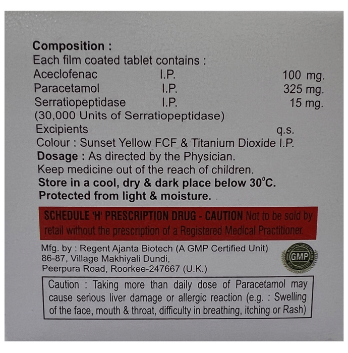Aceclofenac (100mg) + Paracetamol (325mg) + Serratiopeptidase (15mg):<packagingdetail>:Strip: