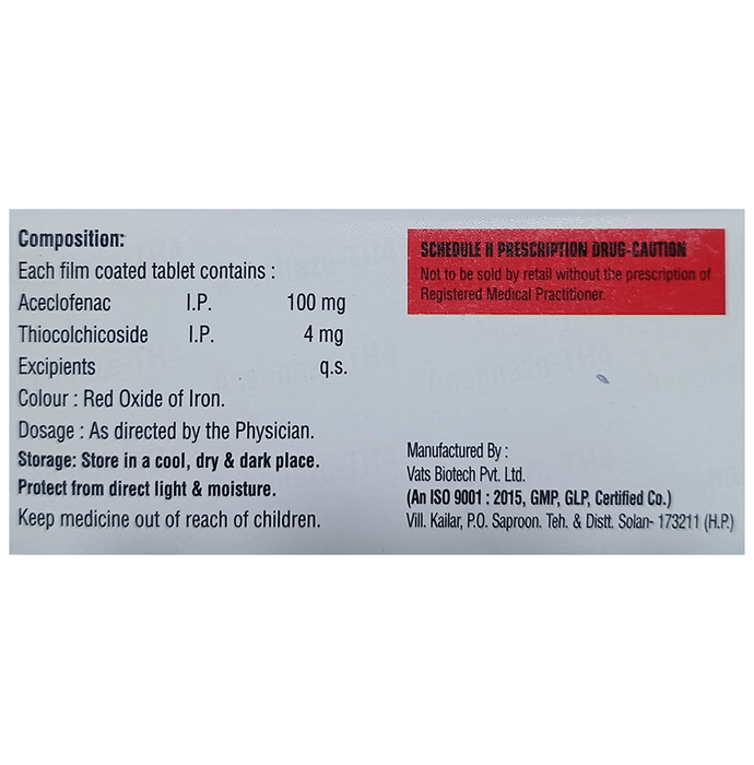 What is Acephaze-TH4 Tablet?::: Acephaze-TH4 Tablet is a combination of two medicines: Aceclofenac and Thiocolchicoside. This medication helps in relieving muscle pain. It relaxes the muscles by acting on the central nervous system and lowering chemical substance in the body that cause pain and inflammation.| Is it safe to use Acephaze-TH4 Tablet?::: Yes, Acephaze-TH4 Tablet is safe for most of the patients. However, in some patients it may cause some common unwanted side effects like nausea, vomiting, stomach pain, heartburn, diarrhoea and other uncommon and rare side effects. Inform your doctor if you experience any persistent problem due to the medication.| Can the Acephaze-TH4 Tablet be stopped when my pain is relieved?::: Acephaze-TH4 Tablet is usually used for short term and can be discontinued when the pain is relieved. However, Acephaze-TH4 Tablet should be continued if your doctor has advised you to do so.| Can the use of Acephaze-TH4 Tablet cause dizziness?::: Yes, the use of Acephaze-TH4 Tablet can cause dizziness (feeling faint, weak, unsteady or lightheaded) in some patients. If you feel dizzy or lightheaded, it is better to rest for some time and resume once you feel better.| Are there any specific contraindications associated with the use of Acephaze-TH4 Tablet?::: The use of Acephaze-TH4 Tablet is considered to be harmful for patients with known allergy to painkillers or any of the components or excipients of this medicine. The use of this medicine should preferably be avoided in patients with a history of stomach ulcer or in patients with active, recurrent stomach ulcer/bleeding. It should also be avoided in patients with history of heart failure, high blood pressure, and liver or kidney disease.| Can Acephaze-TH4 Tablet be taken with Vitamin B-complex?::: Yes, Acephaze-TH4 Tablet can be taken with Vitamin B-complex preparations. While Acephaze-TH4 Tablet helps to relieve pain, Vitamin B-complex can help to correct the vitamin deficiency that might be causing your symptoms.| Can the use of Acephaze-TH4 Tablet cause damage to kidneys?::: Yes, the long-term use of Acephaze-TH4 Tablet can cause damage to the kidneys. Normal kidneys produce a chemical called prostaglandins that protects them from damage. Use of painkillers lower the levels of prostaglandins in the body which leads to kidney damage on long-term use. Use of painkillers is not recommended in patients with underlying kidney disease.| Will Acephaze-TH4 Tablet be more effective if taken in higher doses?::: No, taking more of this medicine will not make it more effective, rather it can lead to increased side effects. If the symptoms are getting severe, please consult the doctor for re-evaluation.: