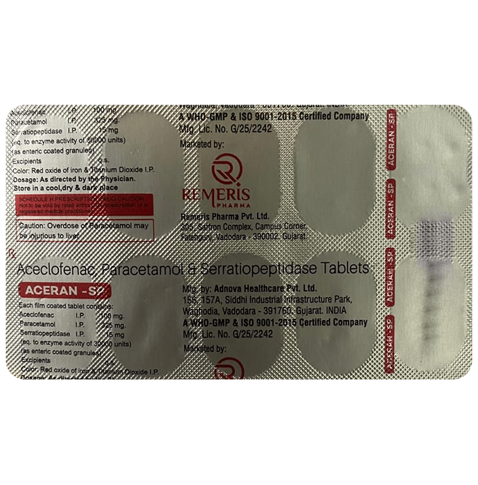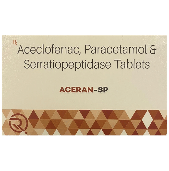 What is Aceran-SP Tablet?::: It is a combination of three medicines: Aceclofenac, Paracetamol, and Serratiopeptidase. This medication helps in relieving pain and inflammation. It works by lowering the levels of chemical substances in the body that cause pain and inflammation.| Is it safe to take Aceran-SP Tablet?::: It is safe to take this medicine for most of the patients. However, in some patients, it may cause unwanted side effects like nausea, vomiting, stomach pain, heartburn, and diarrhea. If you experience any persistent problem due to the medication, inform your doctor as soon as possible.| Can I stop taking Aceran-SP Tablet when my pain is relieved?::: This medicine is usually used for the short term and can be discontinued when your pain is relieved. However, continued taking it if your doctor has advised you to do so.| Can Aceran-SP Tablet cause nausea and vomiting?::: Yes, the use of this medicine can cause nausea and vomiting. In case you experience nausea while taking this medicine, take it with milk, food, or with antacids. Avoid taking fatty or fried foods along with this medication. In case of vomiting, drink plenty of water or other fluids by taking small frequent sips. Talk to your doctor if vomiting persists and you notice signs of dehydration, like dark colored and strong-smelling urine and a low frequency of urination. Do not take any other medicines without speaking to your doctor.| Can Aceran-SP Tablet cause dizziness?::: Yes, the use of this medicine can cause dizziness (feeling faint, weak, unsteady or lightheaded) in some patients. If you feel dizzy or lightheaded, it is better to rest for sometime and resume once you feel better.| Are there any specific contraindications associated with taking Aceran-SP Tablet?::: The use of this medicine is considered harmful for patients with known allergy to any of the components or excipients of this medicine or in patients with known allergy to other painkillers (NSAIDs). Its use should preferably be avoided in patients with a history of stomach ulcers or in patients with active, recurrent stomach ulcers/bleeding. It should also be avoided in patients with a history of heart failure, high blood pressure, and liver or kidney disease.| Can I take Aceran-SP Tablet with vitamin B-complex?::: Yes, this medicine can be taken with vitamin B-complex preparations. While it helps to relieve pain, vitamin B-complex can help to correct the vitamin deficiency that might be causing your symptoms.| Can the use of Aceran-SP Tablet cause damage to kidneys?::: Yes, long-term use of this medicine can cause damage to the kidneys. Normal kidneys produce a chemical called prostaglandins that protect them from damage. The use of painkillers lowers the levels of prostaglandins in the body, which leads to kidney damage on long-term use. The use of painkillers is not recommended in patients with underlying kidney disease.| Can I take a higher dose of Aceran-SP Tablet than recommended?::: No, taking a higher than recommended dose can lead to increased chances of side effects. If you are experiencing increased severity of pain or the pain is not relieved by the recommended doses, please consult your doctor for re-evaluation.| What are the instructions for storage and disposal of Aceran-SP Tablet?::: Keep this medicine in the packet or the container it came in, tightly closed. Store it according to the instructions mentioned on the pack or label. Dispose of the unused medicine. Make sure it is not consumed by pets, children and other people.: