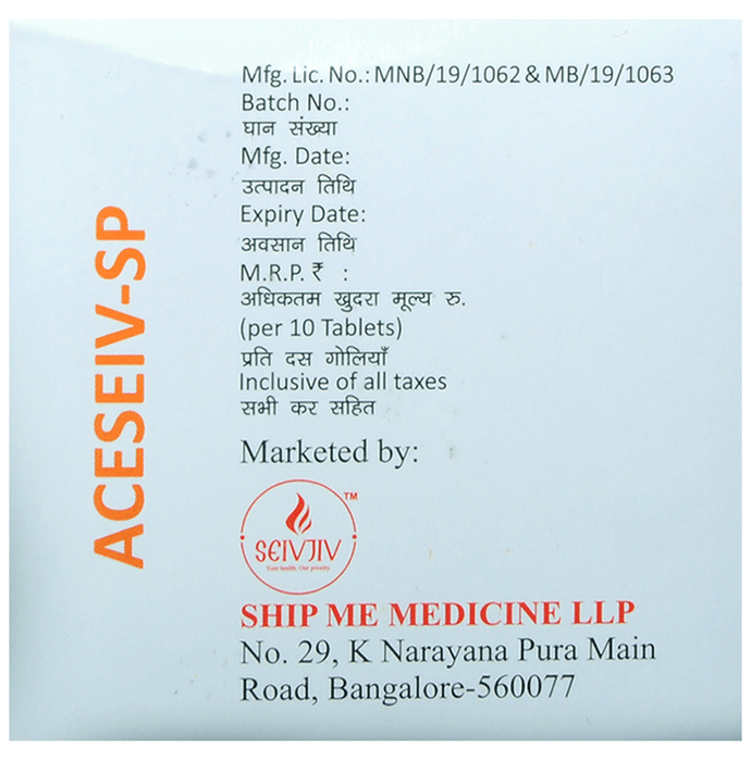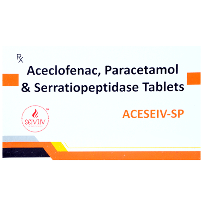 What is Aceseiv-SP Tablet?::: It is a combination of three medicines: Aceclofenac, Paracetamol, and Serratiopeptidase. This medication helps in relieving pain and inflammation. It works by lowering the levels of chemical substances in the body that cause pain and inflammation.| Is it safe to take Aceseiv-SP Tablet?::: It is safe to take this medicine for most of the patients. However, in some patients, it may cause unwanted side effects like nausea, vomiting, stomach pain, heartburn, and diarrhea. If you experience any persistent problem due to the medication, inform your doctor as soon as possible.| Can I stop taking Aceseiv-SP Tablet when my pain is relieved?::: This medicine is usually used for the short term and can be discontinued when your pain is relieved. However, continued taking it if your doctor has advised you to do so.| Can Aceseiv-SP Tablet cause nausea and vomiting?::: Yes, the use of this medicine can cause nausea and vomiting. In case you experience nausea while taking this medicine, take it with milk, food, or with antacids. Avoid taking fatty or fried foods along with this medication. In case of vomiting, drink plenty of water or other fluids by taking small frequent sips. Talk to your doctor if vomiting persists and you notice signs of dehydration, like dark colored and strong-smelling urine and a low frequency of urination. Do not take any other medicines without speaking to your doctor.| Can Aceseiv-SP Tablet cause dizziness?::: Yes, the use of this medicine can cause dizziness (feeling faint, weak, unsteady or lightheaded) in some patients. If you feel dizzy or lightheaded, it is better to rest for sometime and resume once you feel better.| Are there any specific contraindications associated with taking Aceseiv-SP Tablet?::: The use of this medicine is considered harmful for patients with known allergy to any of the components or excipients of this medicine or in patients with known allergy to other painkillers (NSAIDs). Its use should preferably be avoided in patients with a history of stomach ulcers or in patients with active, recurrent stomach ulcers/bleeding. It should also be avoided in patients with a history of heart failure, high blood pressure, and liver or kidney disease.| Can I take Aceseiv-SP Tablet with vitamin B-complex?::: Yes, this medicine can be taken with vitamin B-complex preparations. While it helps to relieve pain, vitamin B-complex can help to correct the vitamin deficiency that might be causing your symptoms.| Can the use of Aceseiv-SP Tablet cause damage to kidneys?::: Yes, long-term use of this medicine can cause damage to the kidneys. Normal kidneys produce a chemical called prostaglandins that protect them from damage. The use of painkillers lowers the levels of prostaglandins in the body, which leads to kidney damage on long-term use. The use of painkillers is not recommended in patients with underlying kidney disease.| Can I take a higher dose of Aceseiv-SP Tablet than recommended?::: No, taking a higher than recommended dose can lead to increased chances of side effects. If you are experiencing increased severity of pain or the pain is not relieved by the recommended doses, please consult your doctor for re-evaluation.| What are the instructions for storage and disposal of Aceseiv-SP Tablet?::: Keep this medicine in the packet or the container it came in, tightly closed. Store it according to the instructions mentioned on the pack or label. Dispose of the unused medicine. Make sure it is not consumed by pets, children and other people.: