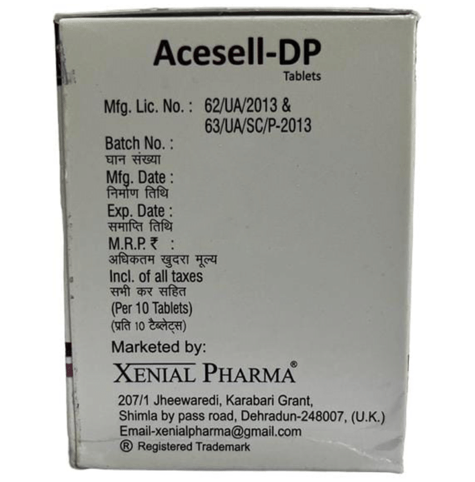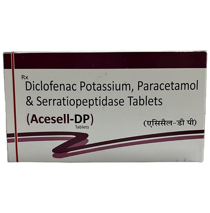What are the storage condition for Acesell-DP Tablet?::: Keep this medicine in the container or the pack it came in, tightly closed. Store it as mentioned on the pack or label. Dispose of the unused medicine. Make sure it is not consumed by pets, children and other people.| What is Acesell-DP Tablet?::: Acesell-DP Tablet is a combination of three medicines: Diclofenac, Paracetamol, and Serratiopeptidase. This medication helps in relieving pain and inflammation. It works by lowering the levels of chemical substances in the body that causes pain and inflammation.| Is it safe to use Acesell-DP Tablet?::: Yes, Acesell-DP Tablet is safe for most of the patients, however, in some patients it may cause common unwanted side effects like nausea, vomiting, stomach pain, heartburn and diarrhea. Inform your doctor as soon as possible if you experience any persistent problem due to the medication.| Can I stop taking Acesell-DP Tablet when my pain is relieved?::: Acesell-DP Tablet is usually used for a short term and can be discontinued when the pain is relieved. However, Acesell-DP Tablet should be continued if you are advised by your physician to do so.| Can the use of Acesell-DP Tablet cause nausea and vomiting?::: Yes, the use of Acesell-DP Tablet can cause nausea and vomiting.Taking it with milk, food or with antacids can prevent nausea. Avoid taking fatty or fried foods along with this medication. In case of vomiting, drink plenty of water or other fluids by taking small frequent sips. Talk to your doctor if vomiting persists and you notice signs of dehydration, like dark colored and strong-smelling urine and a low frequency of urination. Do not take any other medicine without speaking to your doctor.| Can the use of Acesell-DP Tablet cause dizziness?::: Yes, the use of $ame can cause dizziness (feeling faint, weak, unsteady or lightheaded) in some patients. If you feel dizzy or lightheaded, it is better to rest for sometime and resume once you feel better. Do not drive or use any machines.| Are there any specific contraindications associated with the use of Acesell-DP Tablet?::: The use of Acesell-DP Tablet is considered to be harmful for patients with known allergy to any of the components or excipients of this medicine or in patients with known allergy to other painkillers (NSAIDs). The use of this medicine should preferably be avoided in patients with a history of stomach ulcers or in patients with active, recurrent stomach ulcer/bleeding. It should also be avoided in patients with a history of heart failure, high blood pressure, and liver or kidney disease.| Can I take Acesell-DP Tablet with Vitamin B-complex?::: Acesell-DP Tablet can be taken with Vitamin B-complex preparations. While Acesell-DP Tablet helps to relieve pain, Vitamin B-complex can help to correct the vitamin deficiency that might be causing your symptoms.| Can I take Acesell-DP Tablet for stomach pain?::: No, Acesell-DP Tablet preferably should not be taken for stomach pain without consulting a physician. This drug can increase stomach acid secretion which may aggravate an unknown underlying condition.| Can the use of Acesell-DP Tablet cause damage to kidneys?::: No, taking higher than the recommended dose of Acesell-DP Tablet can lead to increased chances of side effects. If you are experiencing increased severity of pain or if the pain is not relieved by the recommended doses, please consult your doctor for re-evaluation.: