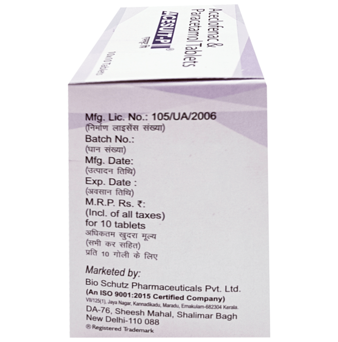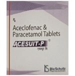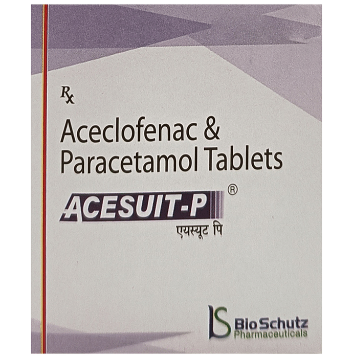 What is Acesuit-P Tablet?::: Acesuit-P Tablet is a combination of two medicines: Aceclofenac and Paracetamol. This medication helps in relieving pain and inflammation. It works by lowering the levels of chemical substances in the body that cause pain and inflammation.| Is it safe to use Acesuit-P Tablet?::: Acesuit-P Tablet is safe for most of the patients. However, in some patients it may cause some unwanted common side effects like nausea, vomiting, stomach pain, heartburn, diarrhea and other uncommon and rare side effects.| Can I stop taking Acesuit-P Tablet when my pain is relieved?::: If you are using the medication for a condition associated with long-term pain then Acesuit-P Tablet should be continued for as long as advised by your physician. It can be discontinued if you are using it for short-term pain relief.| Can the use of Acesuit-P Tablet cause nausea and vomiting?::: Yes, the use of Acesuit-P Tablet can cause nausea and vomiting. Taking it with milk, food or with antacids can prevent nausea. Avoid taking fatty or fried foods along with this medication. In case of vomiting drink plenty of water or other fluids by taking small frequent sips. Talk to your doctor if vomiting persists and you notice signs of dehydration, like dark colored and strong-smelling urine and a low frequency of urination. Do not take any other medicine without speaking to your doctor.| Can the use of Acesuit-P Tablet cause dizziness?::: Yes, the use of Acesuit-P Tablet can cause dizziness (feeling faint, weak, unsteady or lightheaded) in some patients. If you feel dizzy or lightheaded, it is better to rest for sometime and resume once you feel better.| Are there any specific contraindications associated with the use of Acesuit-P Tablet?::: The use of Acesuit-P Tablet is considered to be harmful for patients with known allergy to any of the components or excipients of this medicine or in patients with known allergy to other painkillers (NSAIDs). It should preferably be avoided in patients with a history of stomach ulcers or in patients with active, recurrent stomach ulcer/bleeding. It should also be avoided in patients with a history of heart failure, high blood pressure, and liver or kidney disease.| Can Acesuit-P Tablet be taken with vitamin B-complex?::: Yes, Acesuit-P Tablet can be taken with vitamin B-complex preparations. While Acesuit-P Tablet helps to relieve pain, vitamin B-complex can help to correct the vitamin deficiency that might be causing the underlying painful condition.| Is Acesuit-P Tablet helpful in relieving stomach pain?::: No, Acesuit-P Tablet preferably should not be taken for stomach pain without consulting a physician. This drug can increase stomach acid secretion which may aggravate an unknown underlying condition.| Can the use of Acesuit-P Tablet cause damage to kidneys?::: Yes, the long-term use of Acesuit-P Tablet can cause damage to the kidneys. Normal kidneys produce a chemical messenger called prostaglandins that protects them from damage. Use of painkillers lowers the levels of prostaglandins in the body which leads to kidney damage on long-term use. Use of painkillers is not recommended to patients with underlying kidney disease.| Is it safe to take a higher dose of Acesuit-P Tablet than recommended?::: No, taking higher than the recommended dose of Acesuit-P Tablet can lead to increased chances of side effects like nausea, vomiting, heartburn, indigestion, diarrhea and can also damage your kidneys on long-term use. If you are experiencing increased severity of pain or if the pain is not relieved by the recommended doses of this medicine, please consult your doctor for re-evaluation.| What are the instructions for storage and disposal of Acesuit-P Tablet?::: Keep this medicine in the container or the pack it came in, tightly closed. Store it according to the instructions mentioned on the pack or label. Dispose of the unused medicine. Make sure it is not consumed by pets, children and other people.| How long does it take for Acesuit-P Tablet to show results?::: The effect of Acesuit-P Tablet can be seen within 1.5 to 3 hours of oral administration of the medicine and the time taken to show the desired effects may vary with every individual patient.| What is the dosage of Acesuit-P Tablet?::: You may take one tablet of Acesuit-P Tablet twice daily or as prescribed by your doctor. Always follow your doctor’s instructions while taking this medicine.| Can I take Acesuit-P Tablet along with other painkiller tablets?::: No, it is not recommended to take Acesuit-P Tablet with other painkiller medicines without consulting your doctor since it may cause unwanted side effects like stomach pain or ulcers.| Can Acesuit-P Tablet be given to children?::: No, Acesuit-P Tablet is not recommended for use in children under the age of 18 years.: