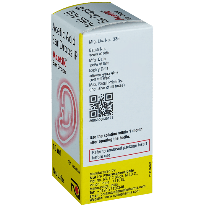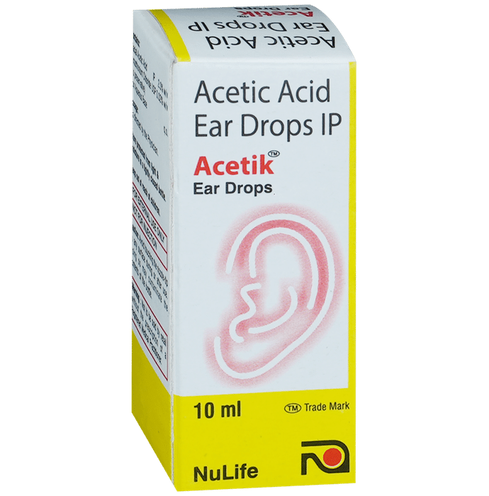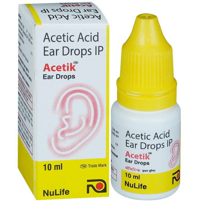 What are acetic acid ear drops used for?::: Acetik Ear Drop contains acetic acid which is effective in treating infections caused by bacteria or fungus in the ear canal. This medicine will not treat an inner ear infection.| What should you inform your doctor before using Acetik Ear Drop?::: Before using this medicine, inform your doctor if you have a hole in your ear drum (ruptured ear drum).| What should I watch for while using this medicine?::: Inform your doctor if pain occurs during use, or if symptoms worsen or do not improve within 48 hours, or if your hearing becomes impaired.| For how long shall I use Acetik Ear Drop?::: It is advisable not to use this medicine for more than 7 days or use it as prescribed by your doctor.| Can Acetik Ear Drop be used in children?::: No, this medicine is not recommended for children under 12 years of age without medical advice.| What are the precautions for ear infections?::: It is important that you keep the infected ear(s) clean and dry. When bathing, try not to get the infected ear(s) wet. Apart from this, do not share ear products or towels, and washcloths with anyone else in order to prevent the spread of infection.: